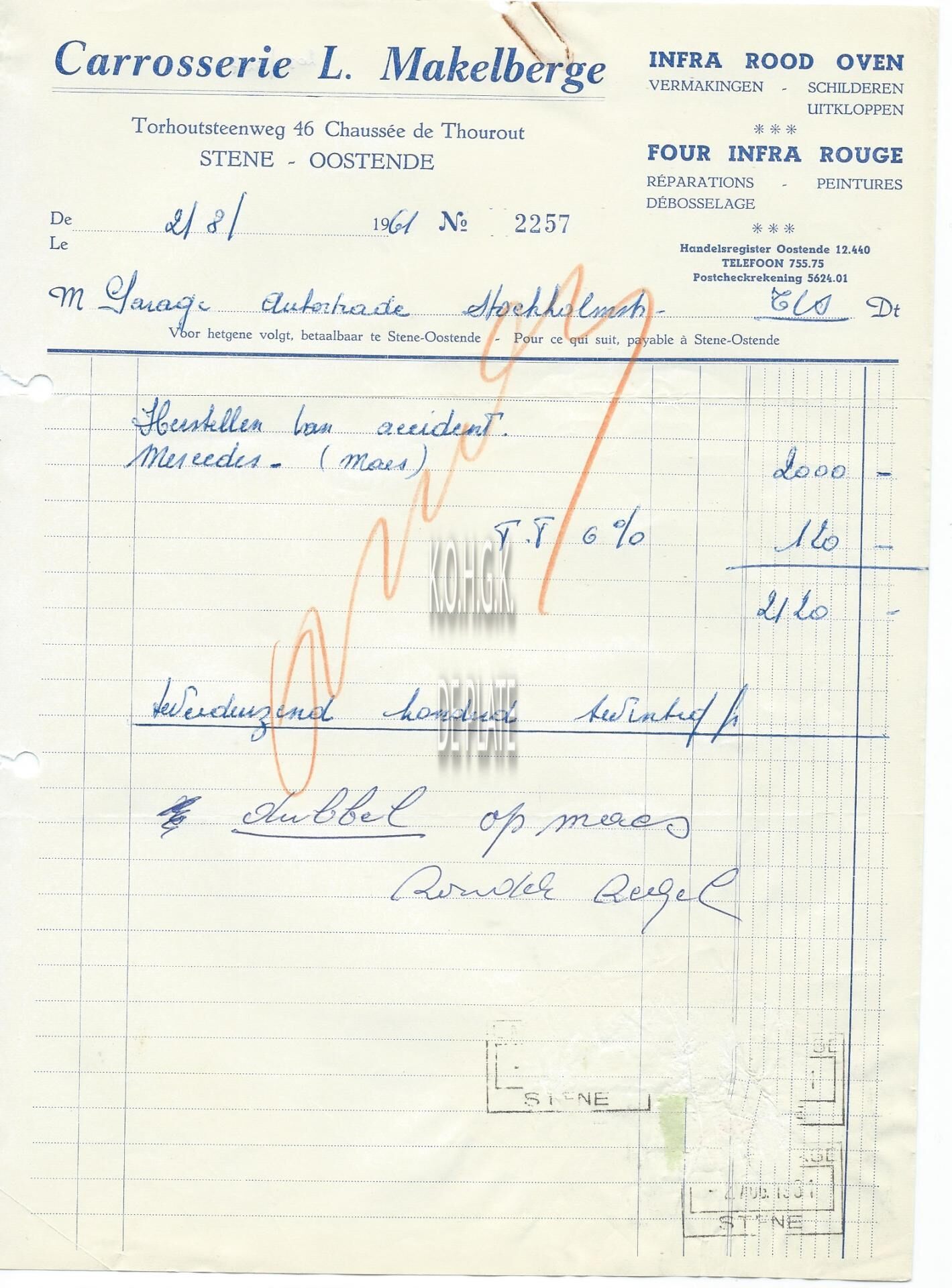 Factuur : L. Makelberge. Carrosserie. Torhoutsesteenweg 46, Stene
