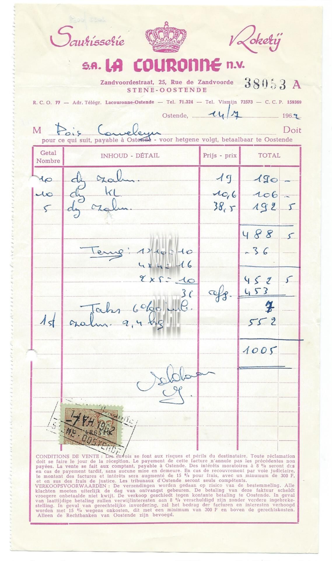 Factuur : La Couronne. Rokerij. Zandvoordestraat 25, Stene