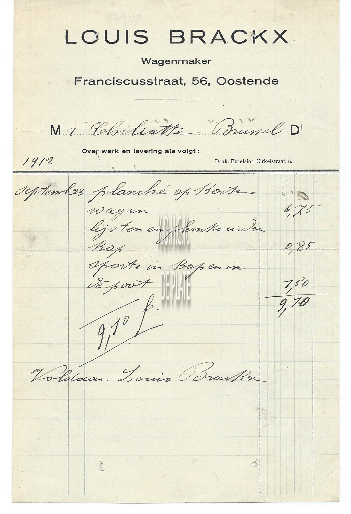 Omschrijving Het herstellen van een kruiwagen Trefwoorden HANDEL ; FACTUREN LOUIS BRACKX (WAGENMAKER) SINT-FRANCISCUSSTRAAT VERVOER ; WAGENMAKERS Plaatskenmerk ARCHIEF 110 ARCHIEFDOOS HANDEL Inventarisnummers 2022/0398 23/ 09/ 1912 Herkomst AANKOOP Vervaardiger Excelsior (drukkerij) Print