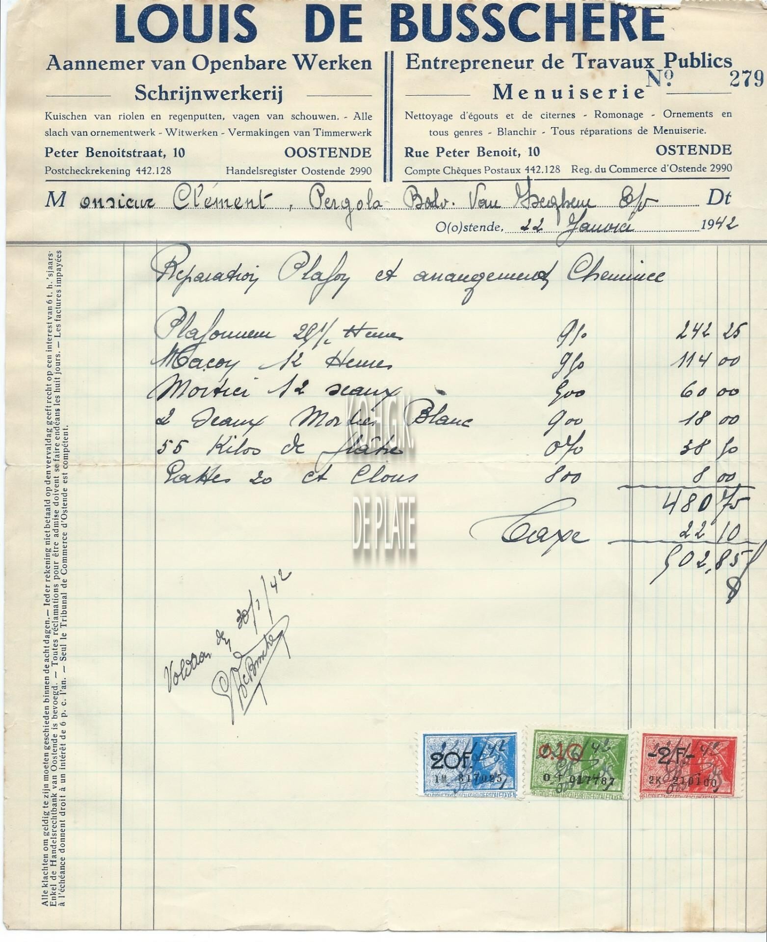 Factuur : Louis De Busschere. Schrijnwerkerij - Aannemer van openbare werken. Peter Benoitstraat 10, Oostende