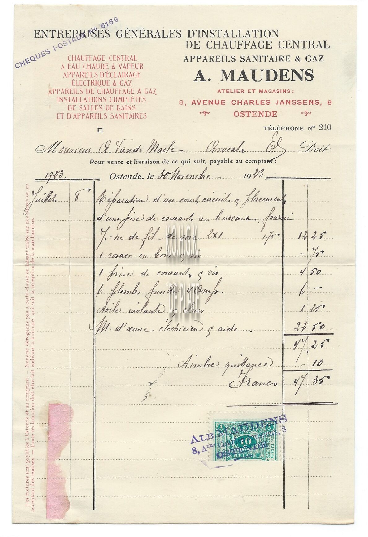 Factuur : A. Maudens. Sanitair. Karel Janssenslaan 8, Oostende