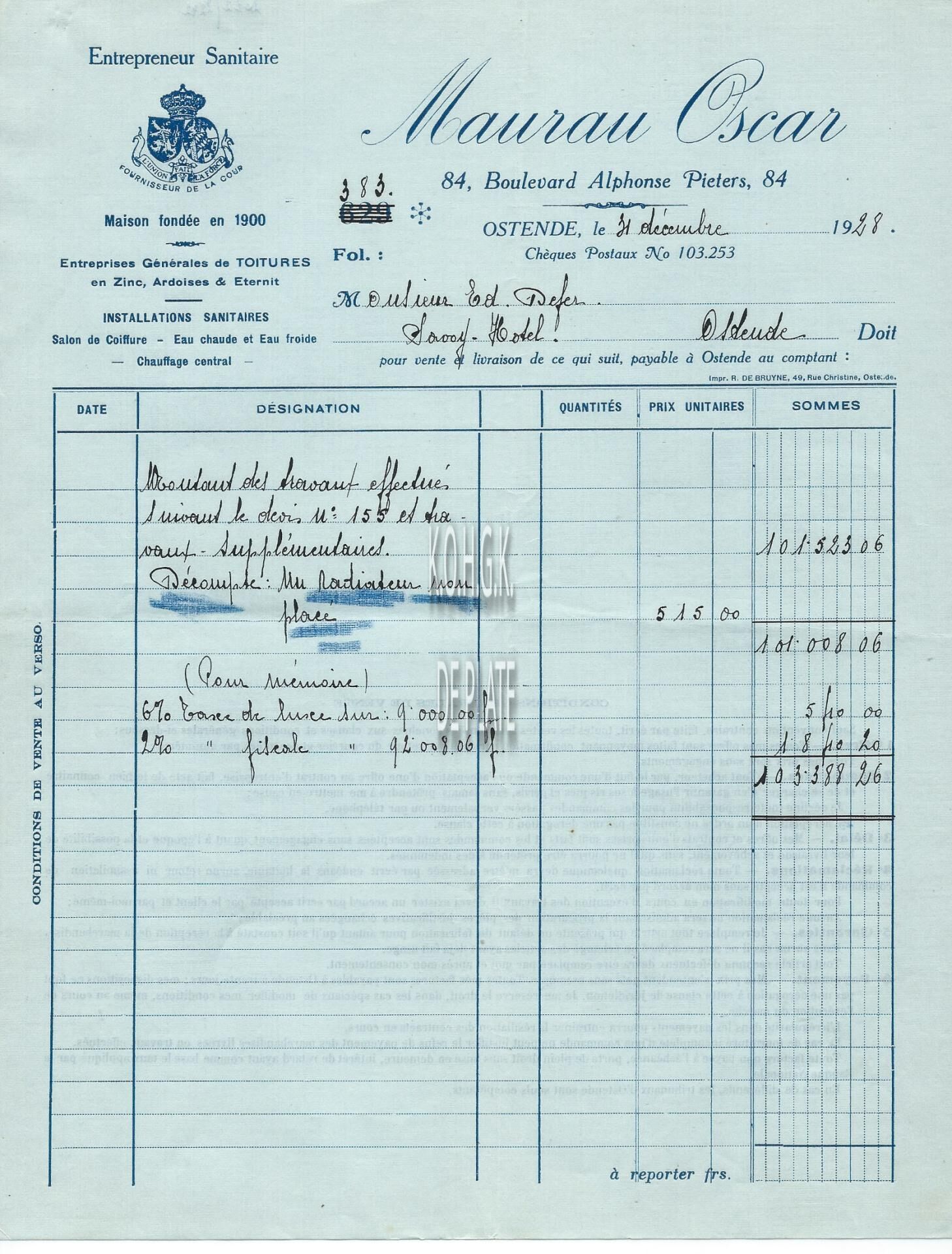 Factuur : Maurau Oscar. Sanitair. Alfons Pieterslaan 84, Oostende