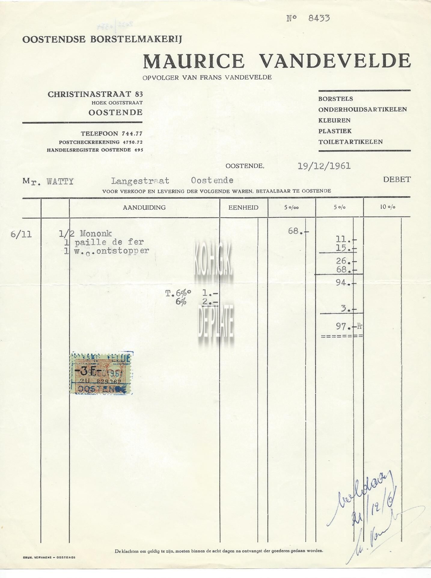 Factuur : Maurice Vandevelde. Oostendse Borstelmakerij. Christinastraat 83, Oostende