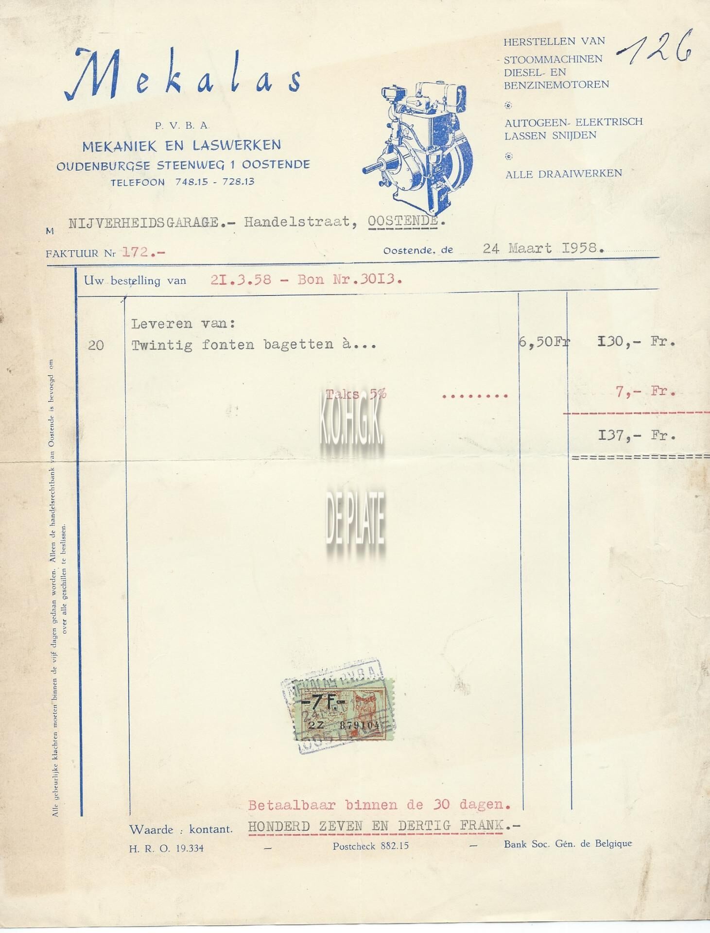 Factuur : Mekalas. Mekaniek en Laswerken. Oudenburgsesteenweg 1, Oostende