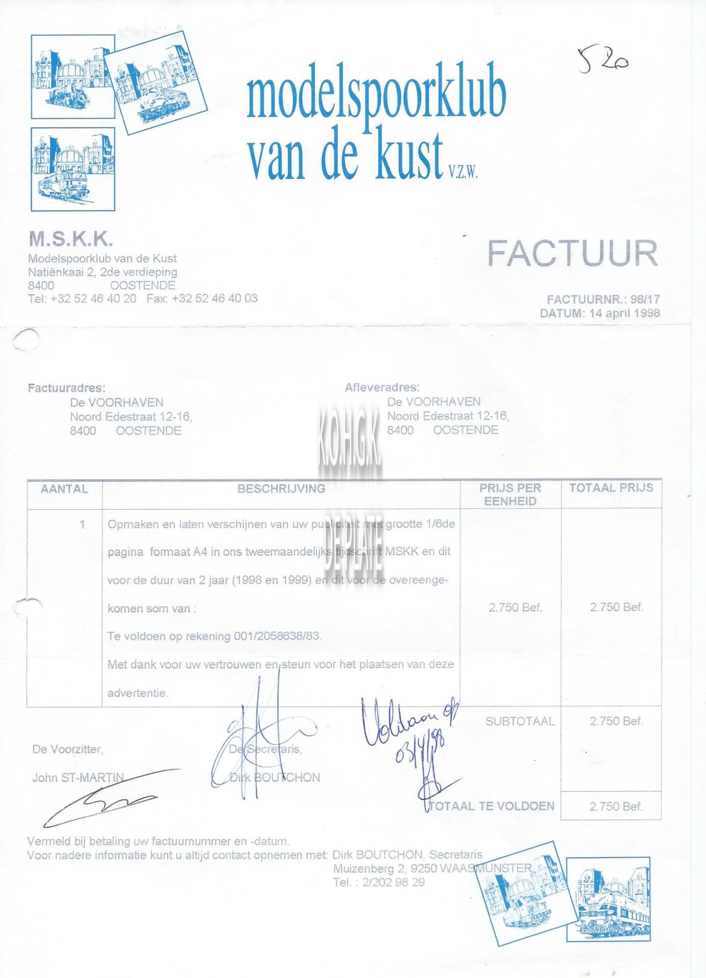 Factuur : Modelspoorklub van de kust (MSKK), Natiënkaai 2, Oostende