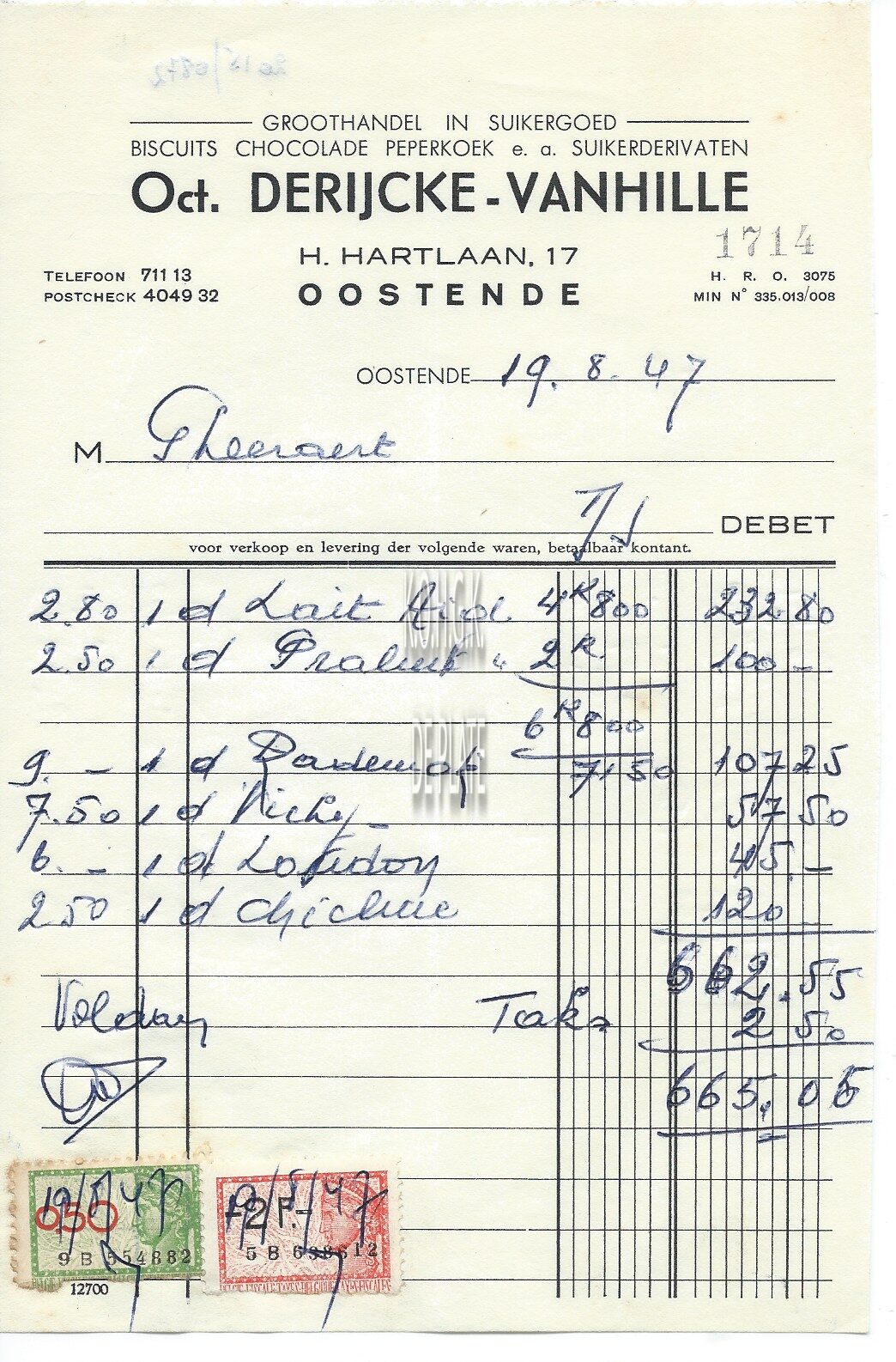 Omschrijving Biscuits, chocolade, peperkoek e.a. suikerderivaten Trefwoorden HANDEL ; FACTUREN OCT. DERIJCKE-VANHILLE (GROOTHANDEL IN SNOEPGOED) HEILIG HARTLAAN Plaatskenmerk ARCHIEF 110 ARCHIEFDOOS HANDEL Inventarisnummers 2015/0872 19/ 08/ 1947 Print