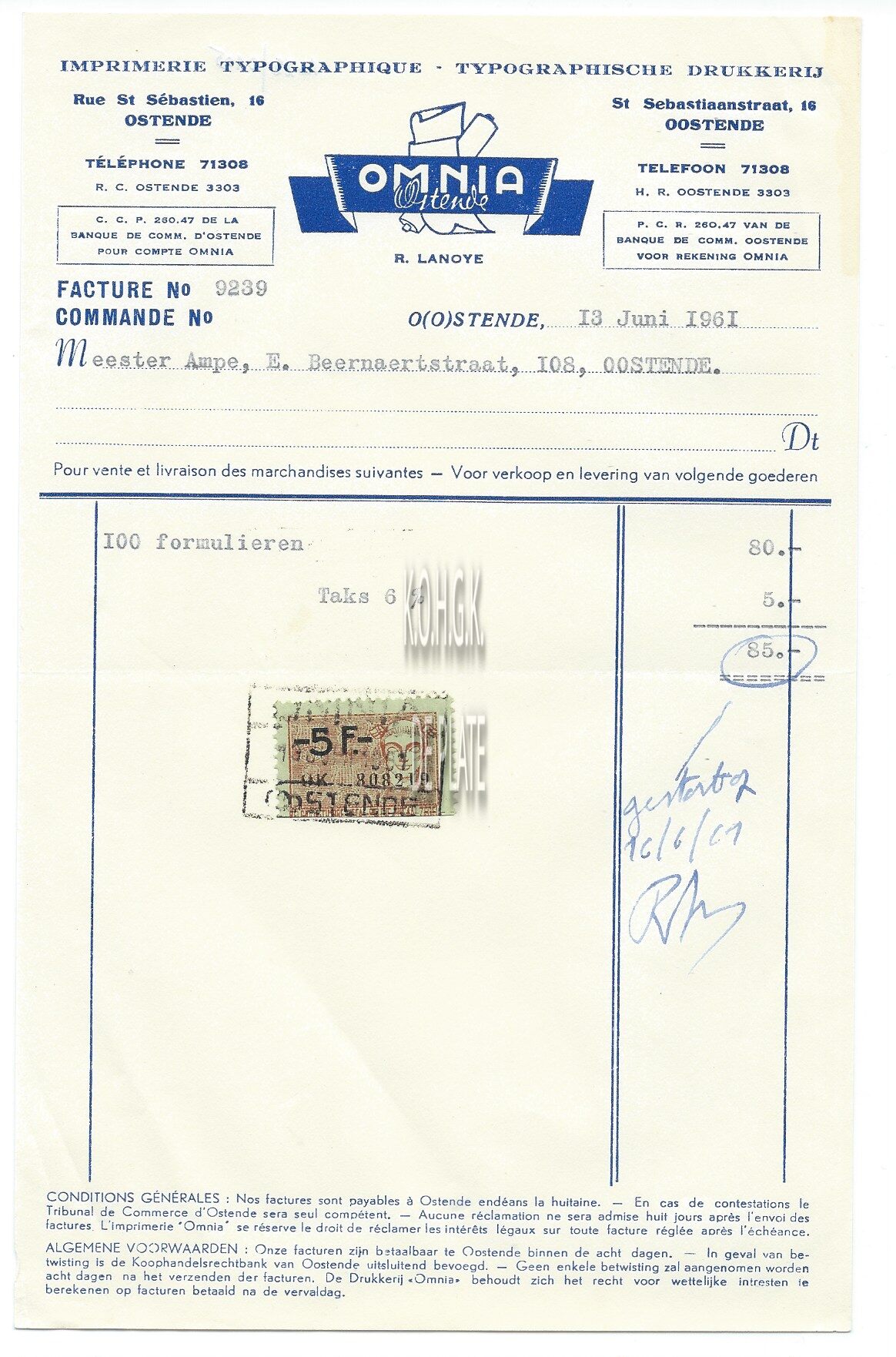 Omschrijving R. Lanoye Trefwoorden HANDEL ; FACTUREN DRUKKERIJ UITGEVERIJ OMNIA EREL DRUKKERIJEN SINT-SEBASTIAANSTRAAT Plaatskenmerk ARCHIEF 110 ARCHIEFDOOS HANDEL Inventarisnummers 2022/0105 13/ 06/ 1961 Herkomst AANKOOP Print