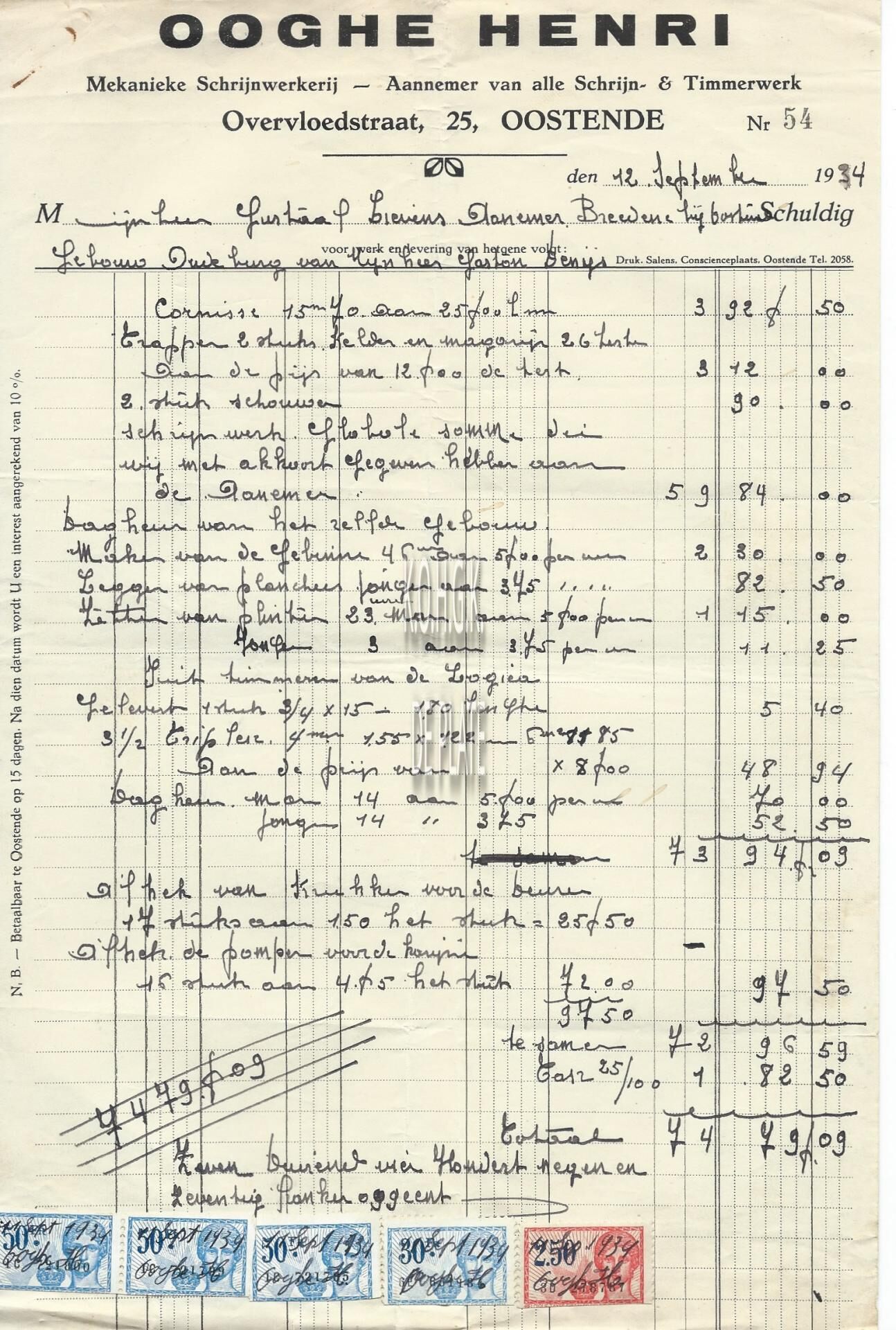 Trefwoorden HANDEL ; FACTUREN OOGHE HENRI (SCHRIJNWERKERIJ) OVERVLOEDSTRAAT Plaatskenmerk ARCHIEF 110 ARCHIEFDOOS HANDEL Inventarisnummers 2022/0286 12/ 09/ 1934 Herkomst AANKOOP Vervaardiger Drukkerij Salens Print