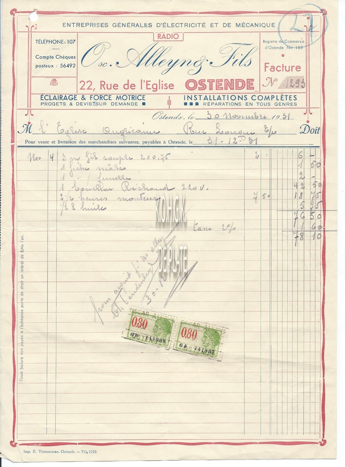 Factuur : Osc. Alleyn Fils. Elektriciteitshandel. Kerkstraat 29, Oostende