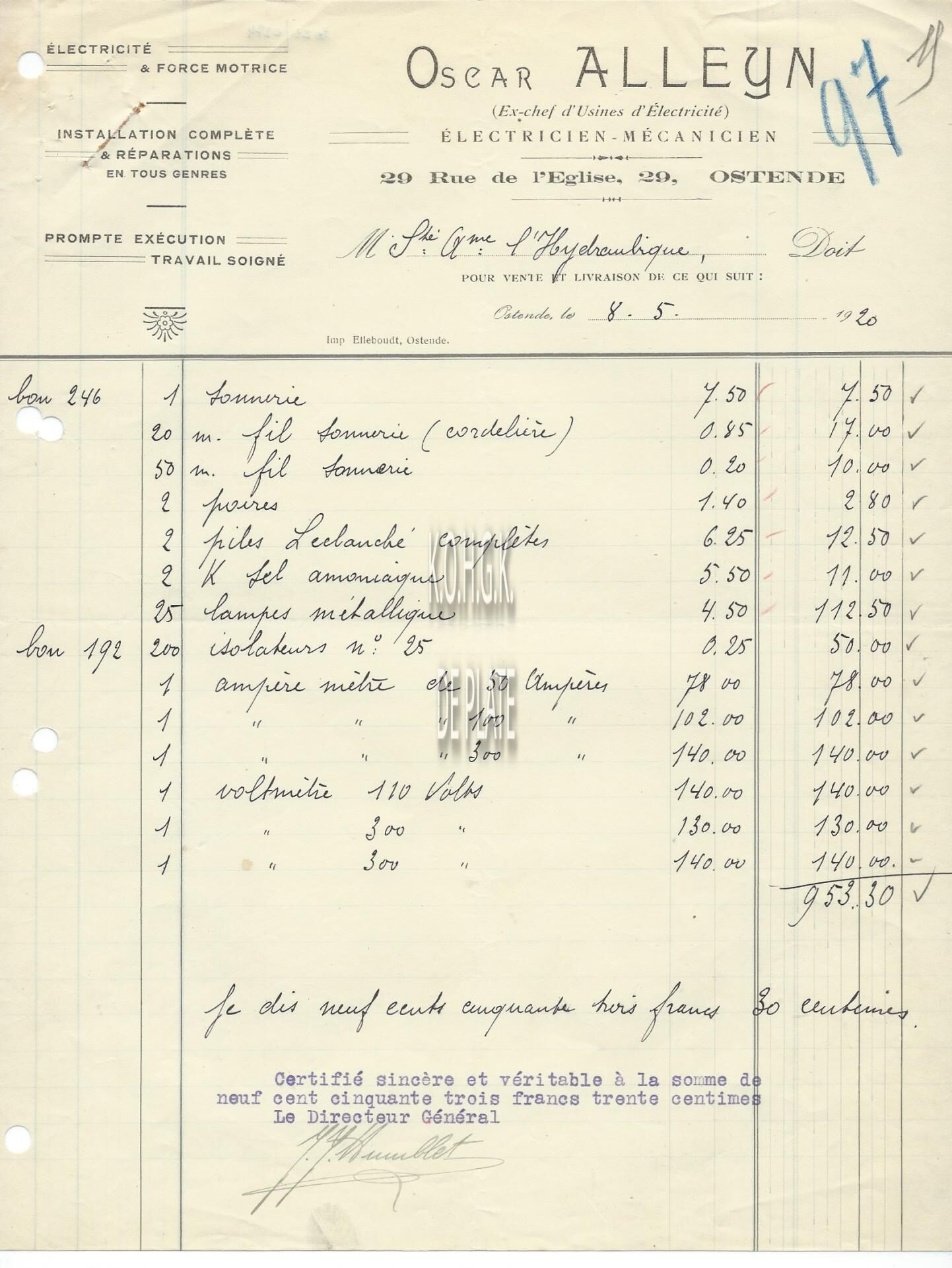Trefwoorden HANDEL ; FACTUREN OSCAR ALLEYN (ELEKTRICITEITSHANDEL) KERKSTRAAT Plaatskenmerk ARCHIEF 110 ARCHIEFDOOS HANDEL Inventarisnummers 2022/0274 08/ 05/ 1920 Herkomst AANKOOP Vervaardiger Imp. Elleboudt Print