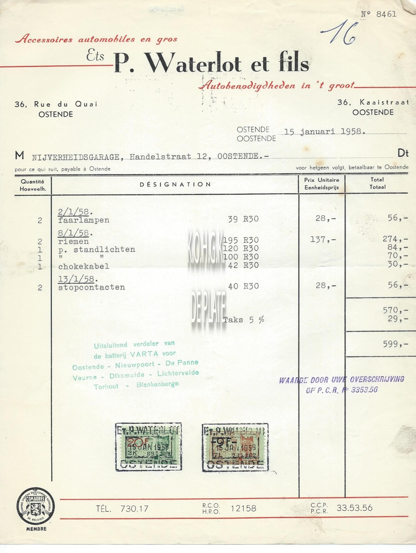 Factuur : P. Waterlot et Fils. Auto onderdelen. Kaaistraat 36, Oostende
