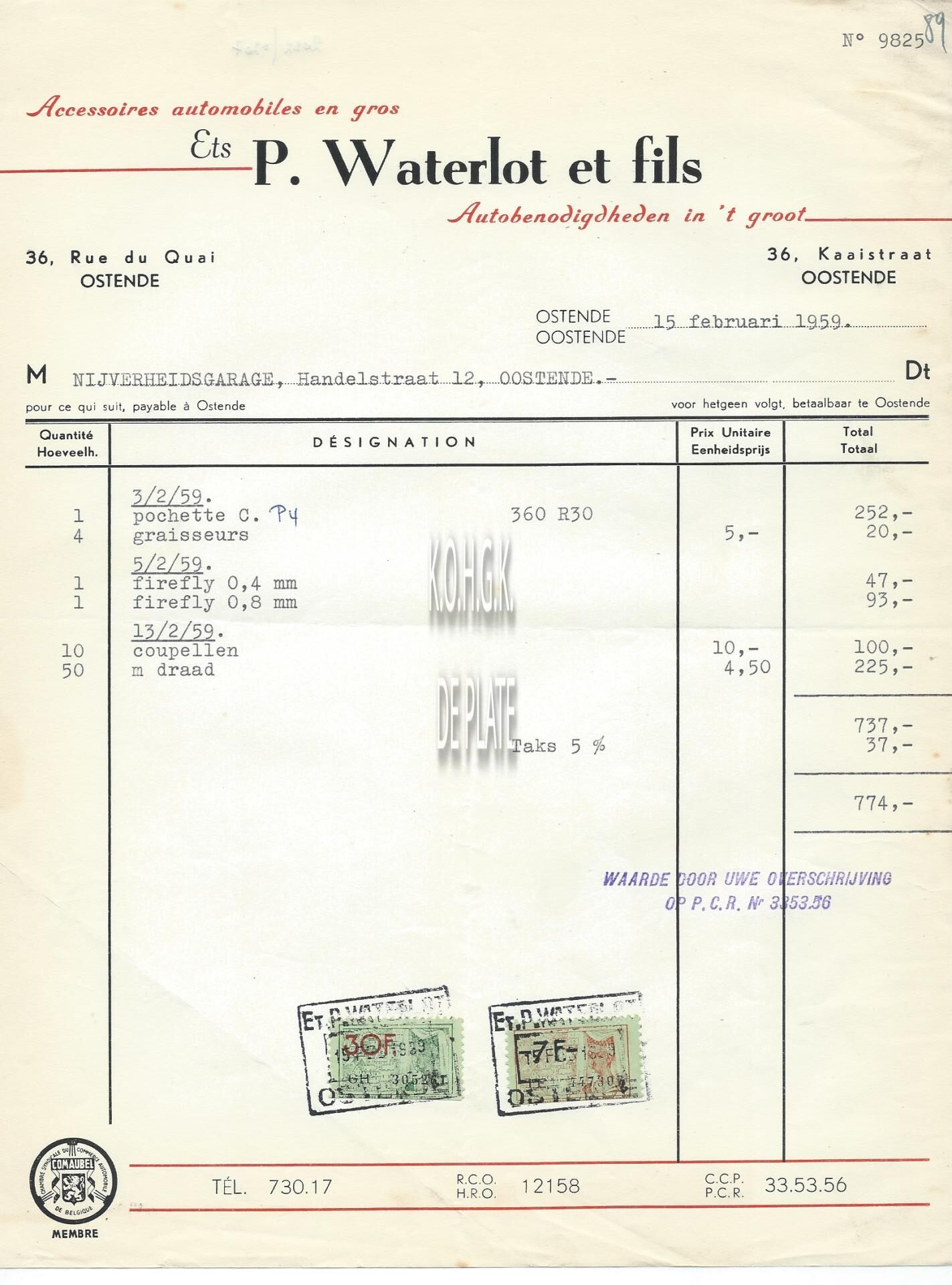 Trefwoorden HANDEL ; FACTUREN P. WATERLOT ET FILS (AUTO ONDERDELEN) HANDEL ; AUTO ONDERDELEN KAAISTRAAT Plaatskenmerk ARCHIEF 110 ARCHIEFDOOS HANDEL Inventarisnummers 2022/0207 15/ 02/ 1959 Herkomst AANKOOP Print