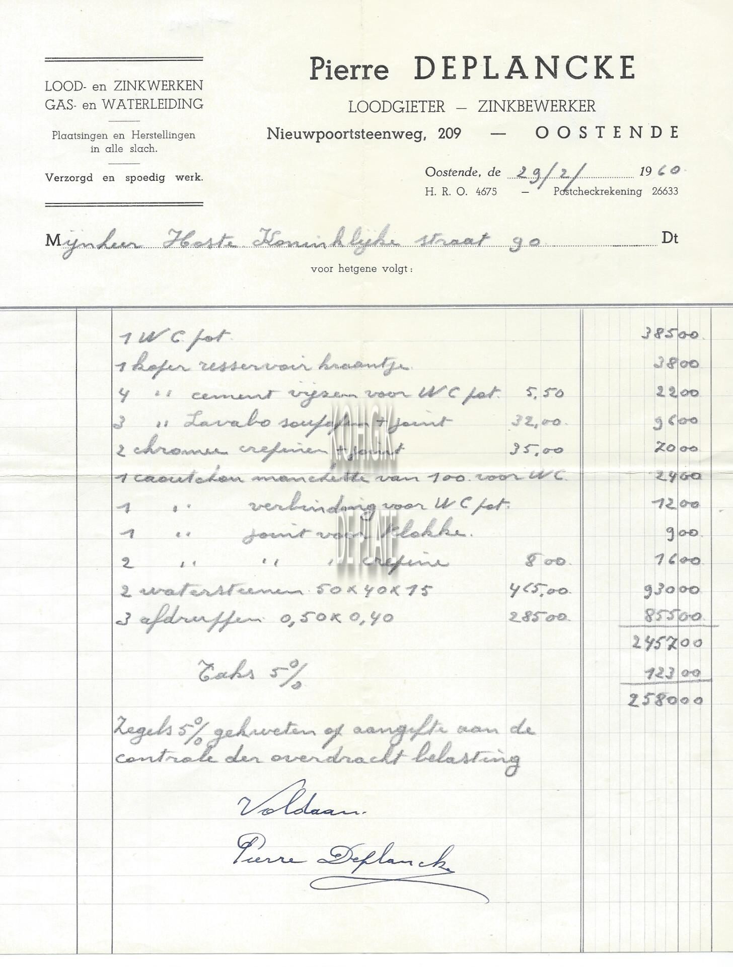 Omschrijving Lood- en zinkwerken. Gas- en waterleiding. Trefwoorden HANDEL ; FACTUREN DEPLANCKE PIERRE (LOODGIETER) SANITAIR NIEUWPOORTSESTEENWEG Plaatskenmerk ARCHIEF 110 ARCHIEFDOOS HANDEL Inventarisnummers 2007/0642 29/ 12/ 1960 Print