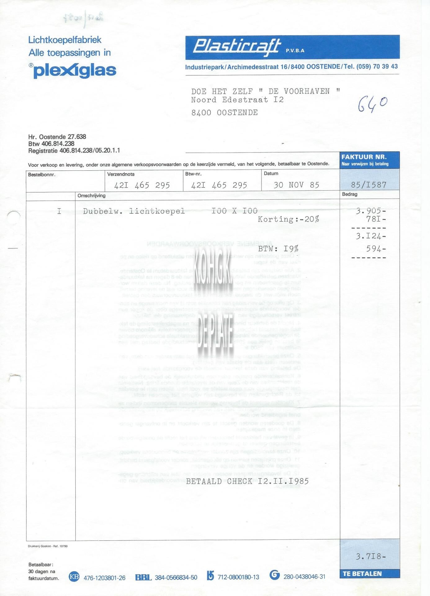 Omschrijving Alle toepassingen in "plexiglas" Trefwoorden HANDEL ; FACTUREN PLASTICRAFT (KUNSTSTOFVERWERKEND BEDRIJF) ARCHIMEDESSTRAAT NIJVERHEID ; INDUSTRIEPARK Plaatskenmerk ARCHIEF 110 ARCHIEFDOOS HANDEL Inventarisnummers 2017/0087 30/ 11/ 1985 Herkomst AANKOOP Vervaardiger Drukkerij Goekint Print