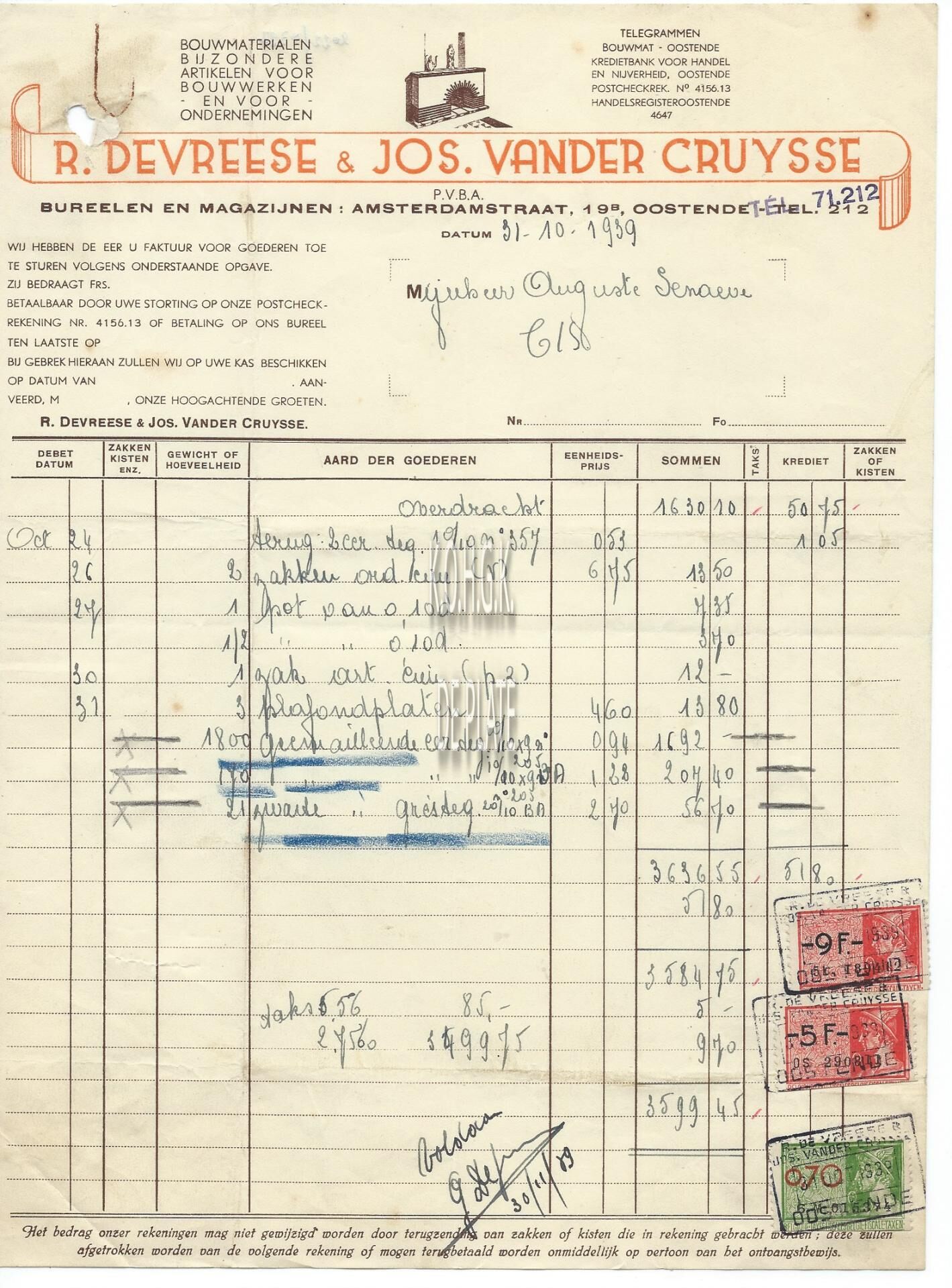 Factuur : R. Devreese & Jos. Vander Cruysse. Bouwmaterialen. Amsterdamstraat 19b, Oostende