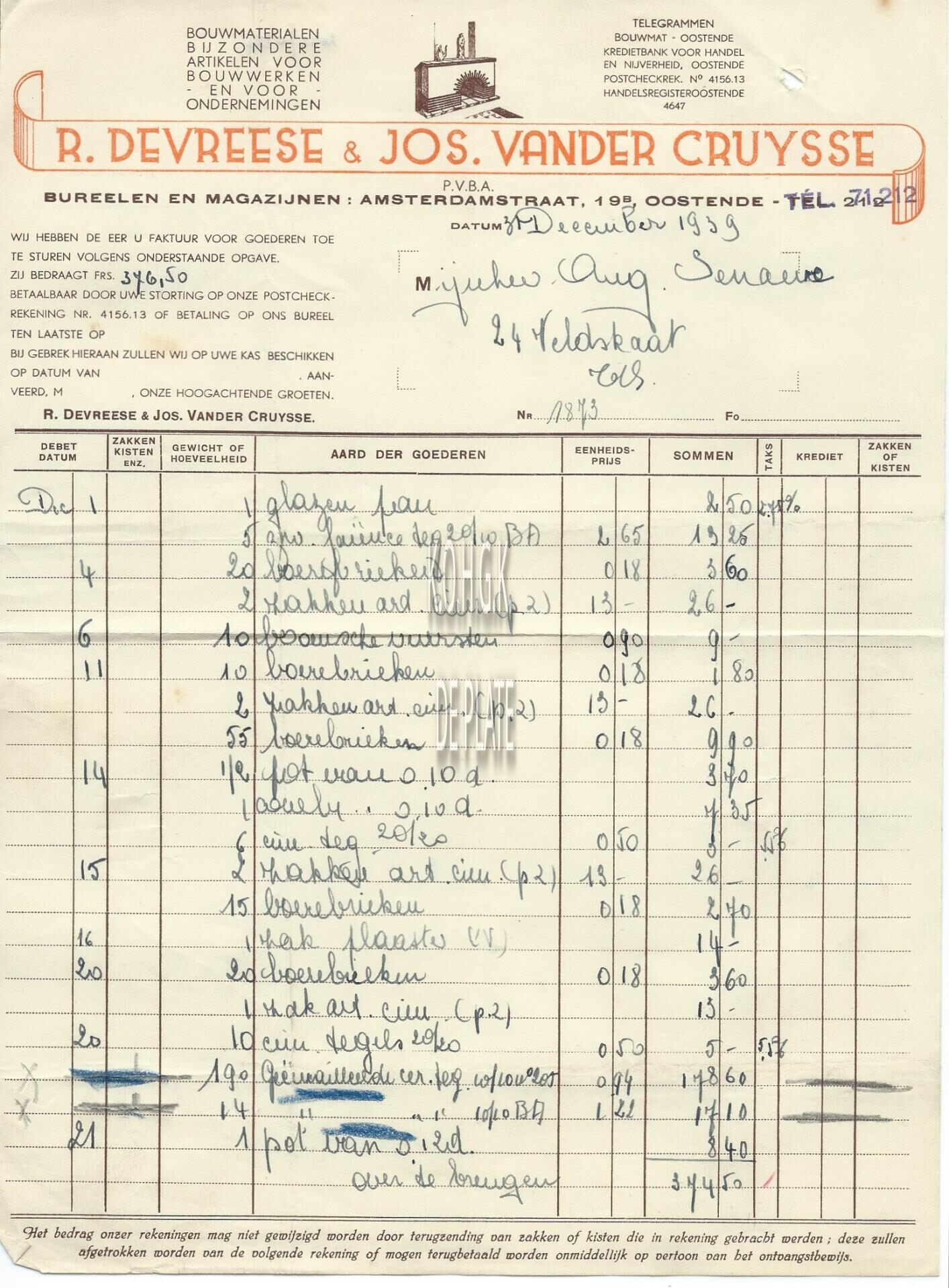 Trefwoorden HANDEL ; FACTUREN R. DEVREESE EN JOS. VANDER CRUYSSE (BOUWMATERIALEN) NIJVERHEID ; BOUWMATERIALEN AMSTERDAMSTRAAT Plaatskenmerk ARCHIEF 110 ARCHIEFDOOS HANDEL Inventarisnummers 2022/0287 31/ 12/ 1939 Herkomst AANKOOP Print