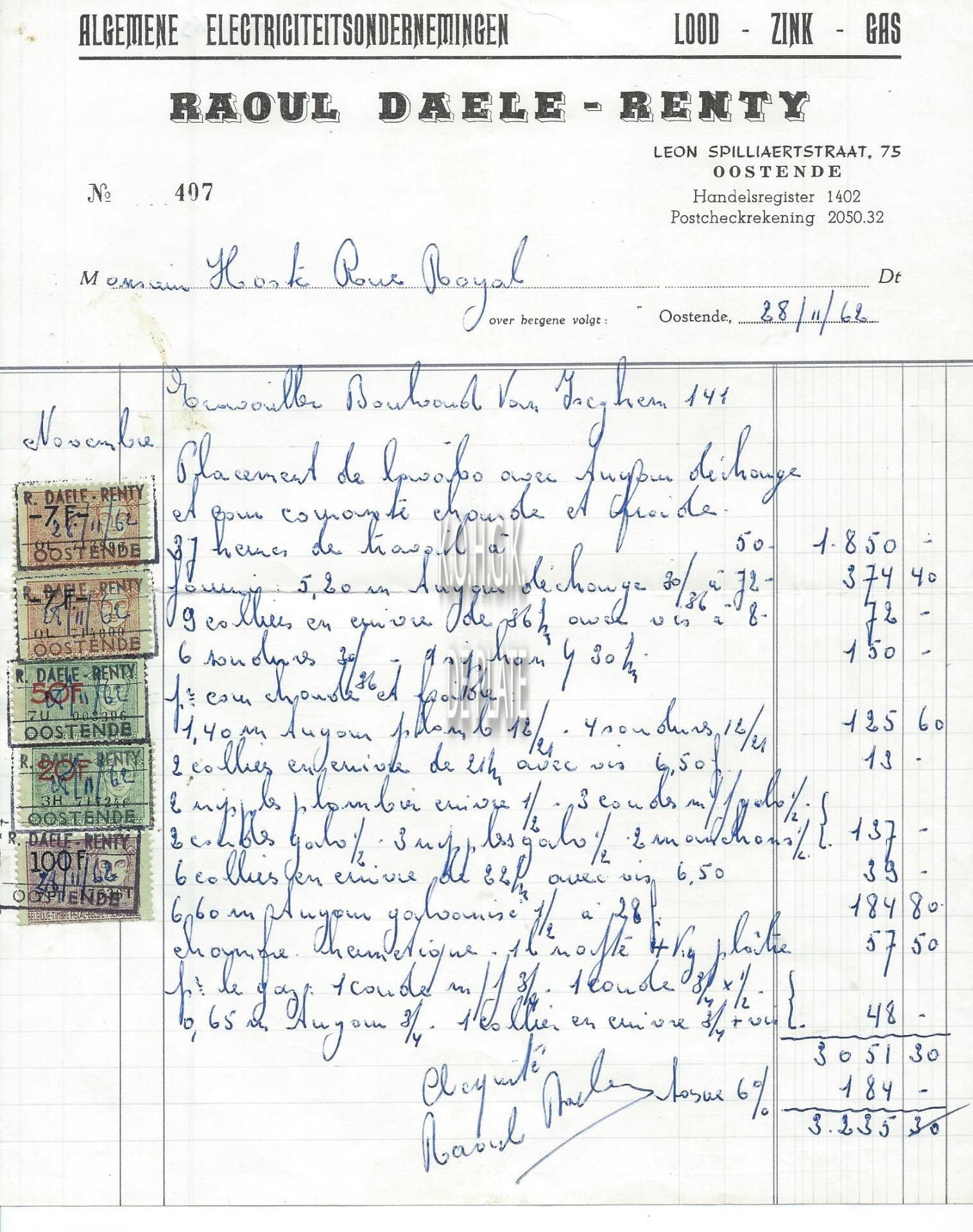 Factuur : Raoul Daele-Renty. Algemene Electriciteitsondernemingen - Lood Zink Gas. Leon Spilliaertstraat 75, Oostende