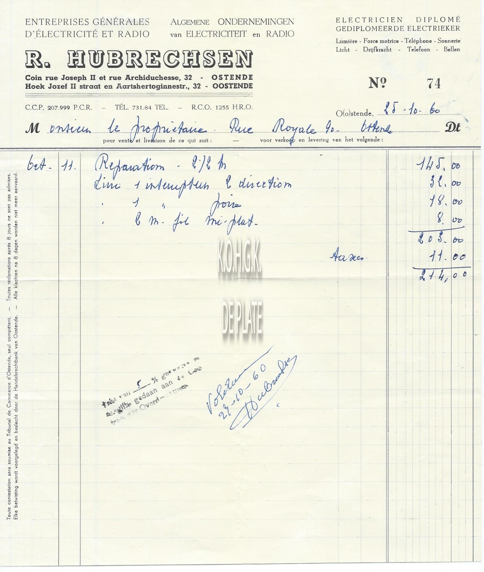 Factuur : Remy Hubrechsen. Entreprises Générales d'Electricité et Radio. Hoek Jozef II-straat en Aartshertoginnestraat 32, Oostende