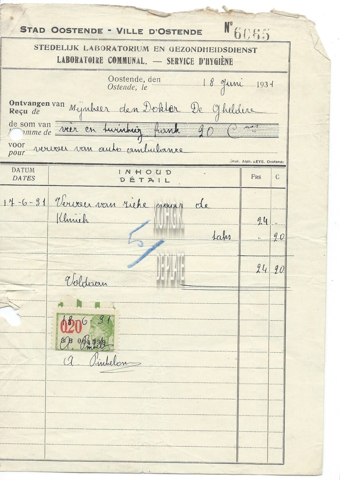 Factuur : Stad Oostende. Stedelijk Laboratorium en Gezondheidsdienst.