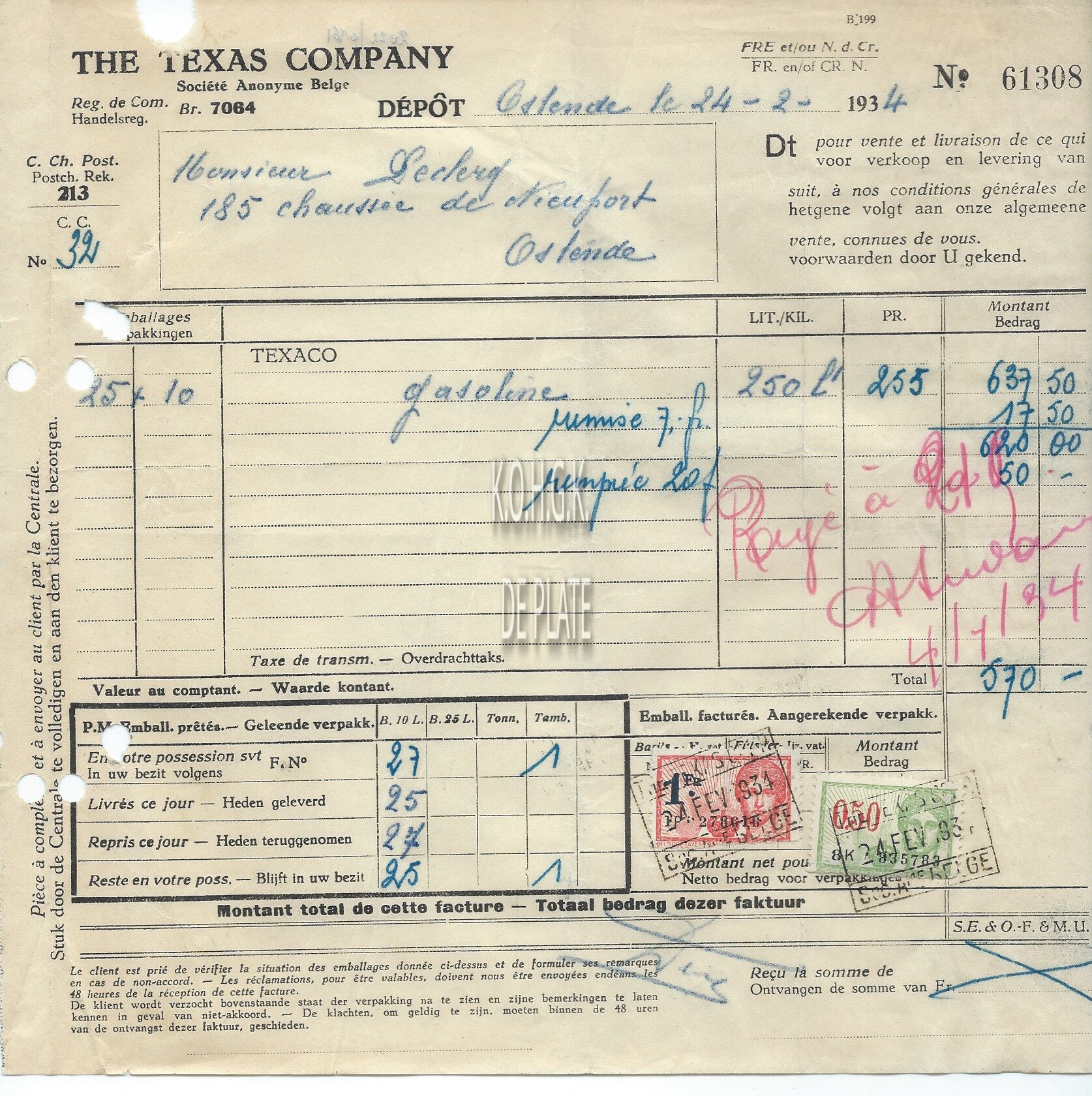 Factuur : The Texas Company. Petroleummaatschappij. Depot Oostende