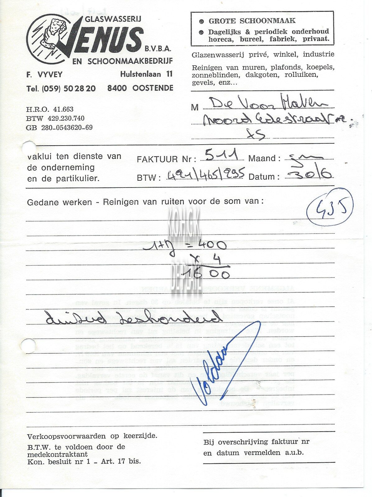 Factuur : Venus. Glaswasserij en schoonmaakbedrijf. Hulstenlaan 11, Oostende