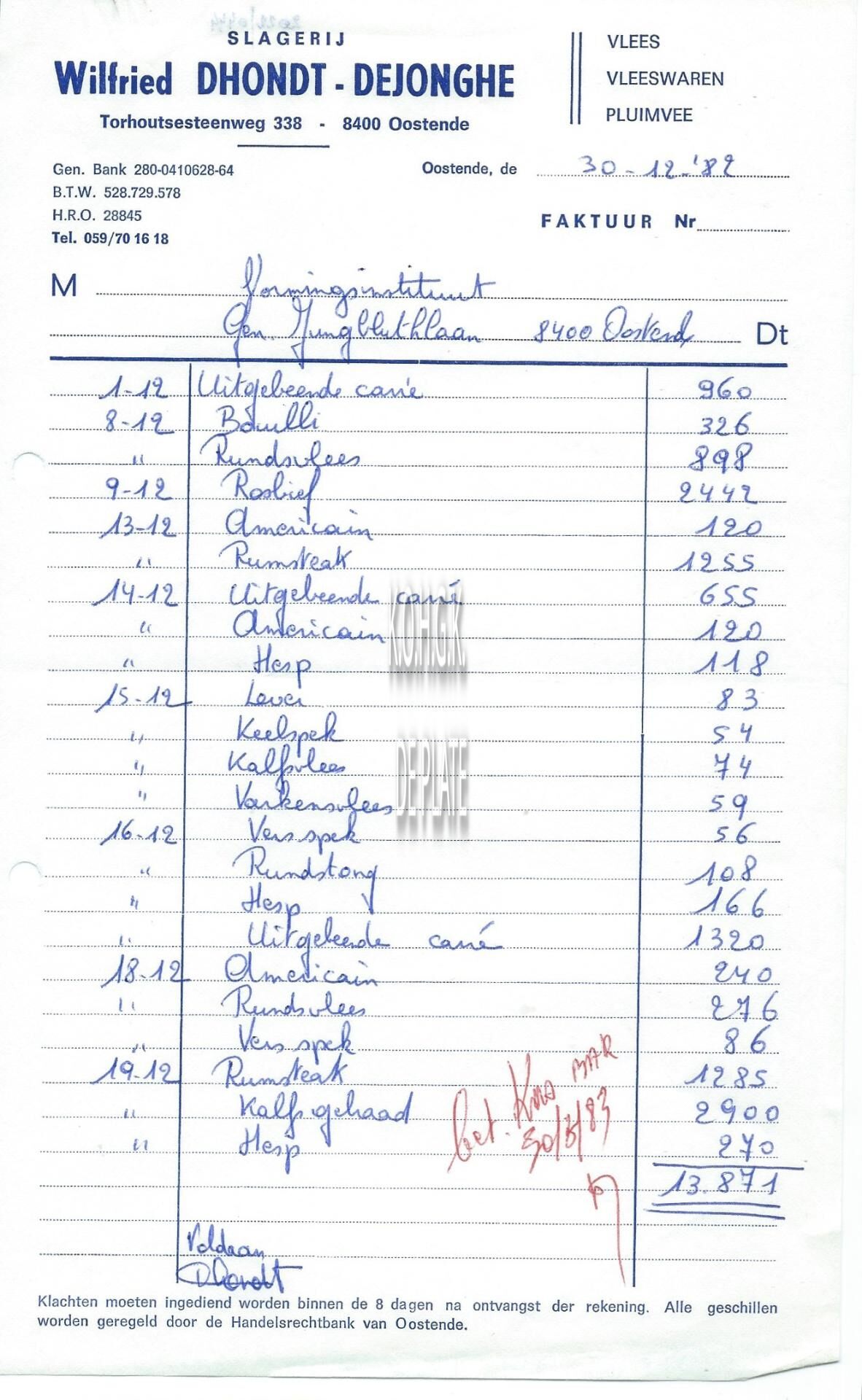 Factuur : Wilfried Dhondt-Dejonghe. Slagerij. Torhoutsesteenweg 338, Oostende