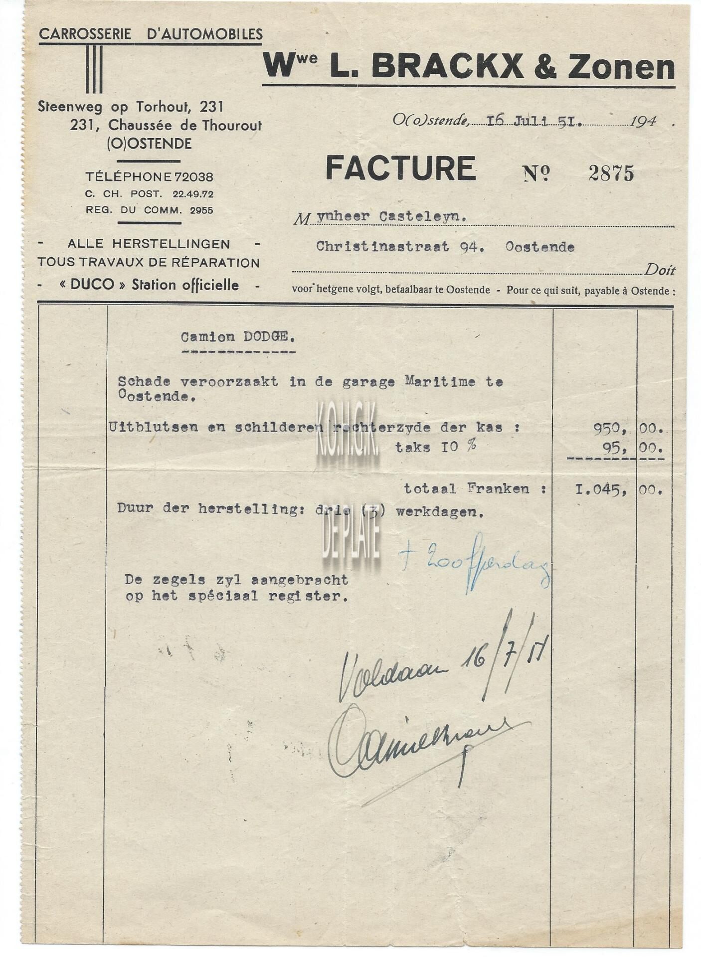Trefwoorden HANDEL ; FACTUREN WEDUWE L. BRACKX EN ZONEN (CARROSSERIE) VERVOER ; CARROSSERIEBEDRIJVEN TORHOUTSESTEENWEG Plaatskenmerk ARCHIEF 110 ARCHIEFDOOS HANDEL Inventarisnummers 2022/0224 16/ 07/ 1951 Herkomst AANKOOP Print
