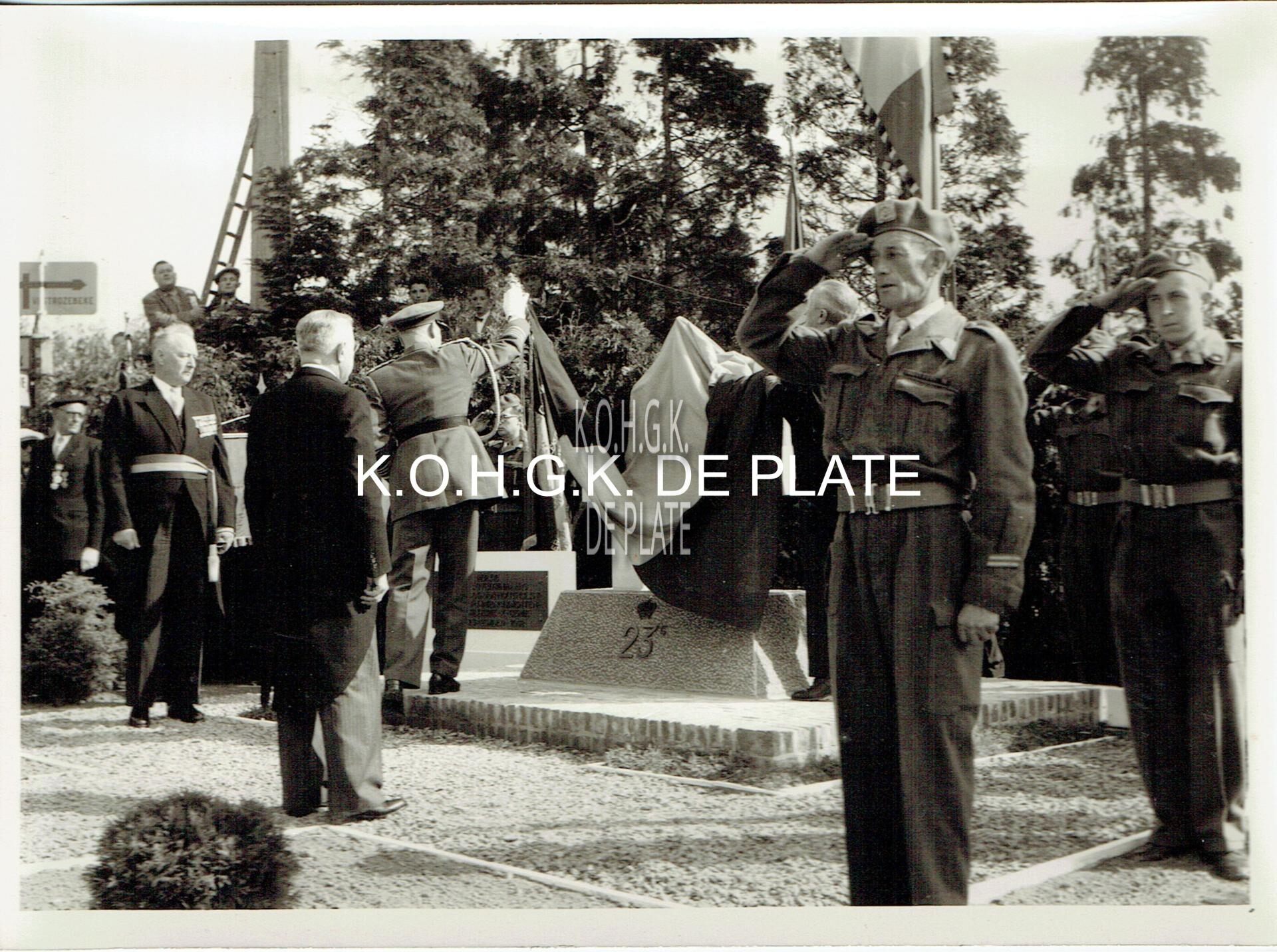 Formaat : 13 x 18 cm. - Inhuldiging van het gedenkteken van het 23ste Linieregiment te Houthulst, 23 september 1956 door de Broederbond der Oudstrijders van de 3de en 23ste Linieregimenten 1914-1918. - Inauguration du Monument du 23e Régiment de Ligne  à Houthulst le 23 septembre 1956 par la Fraternelle des Anciens Combattants du 3e et 23e Régiments de Ligne 1914-1918