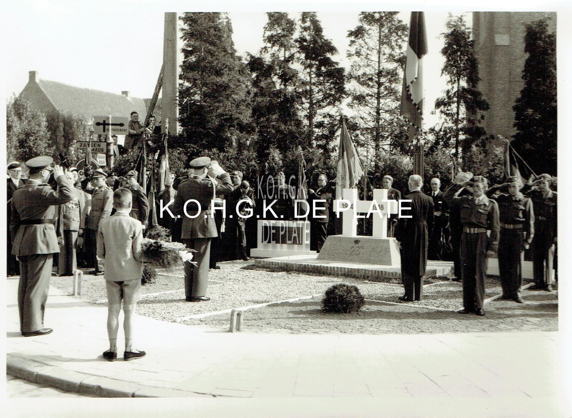 Formaat : 13 x 18 cm. - Inhuldiging van het gedenkteken van het 23ste Linieregiment te Houthulst, 23 september 1956 door de Broederbond der Oudstrijders van de 3de en 23ste Linieregimenten 1914-1918. - Inauguration du Monument du 23e Régiment de Ligne à Houthulst le 23 septembre 1956 par la Fraternelle des Anciens Combattants du 3e et 23e Régiments de Ligne 1914-1918