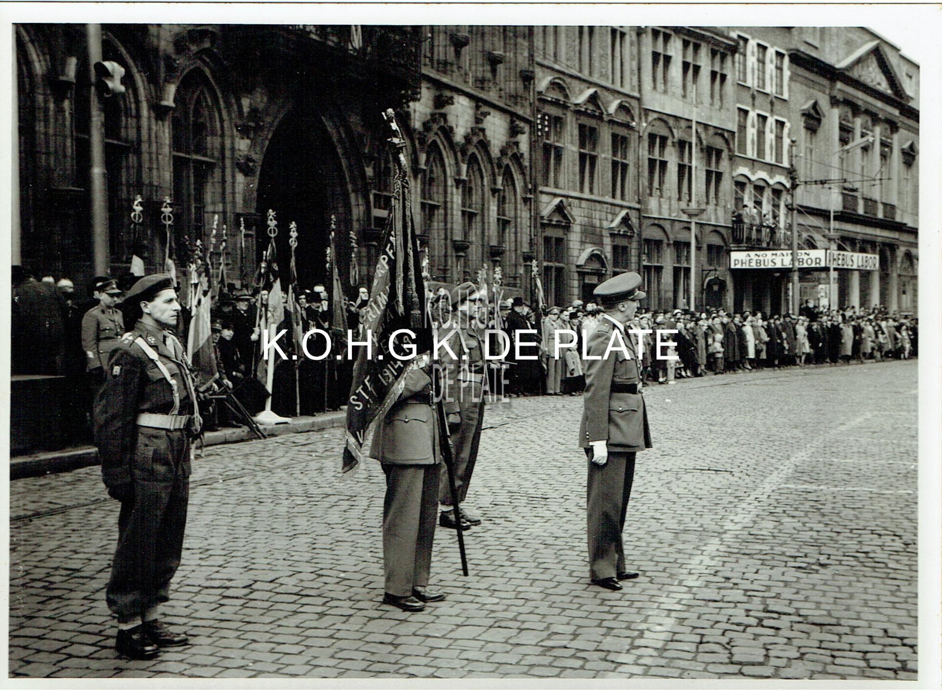 Formaat : 13 x 18 cm. - Plechtige overhandiging van het vaandel van het 3de Linieregiment aan het 3de Liniebataljon te Bergen. - Remise officielle du drapeau du 3e Régiment de Ligne au 3e Batallion de Ligne à Mons