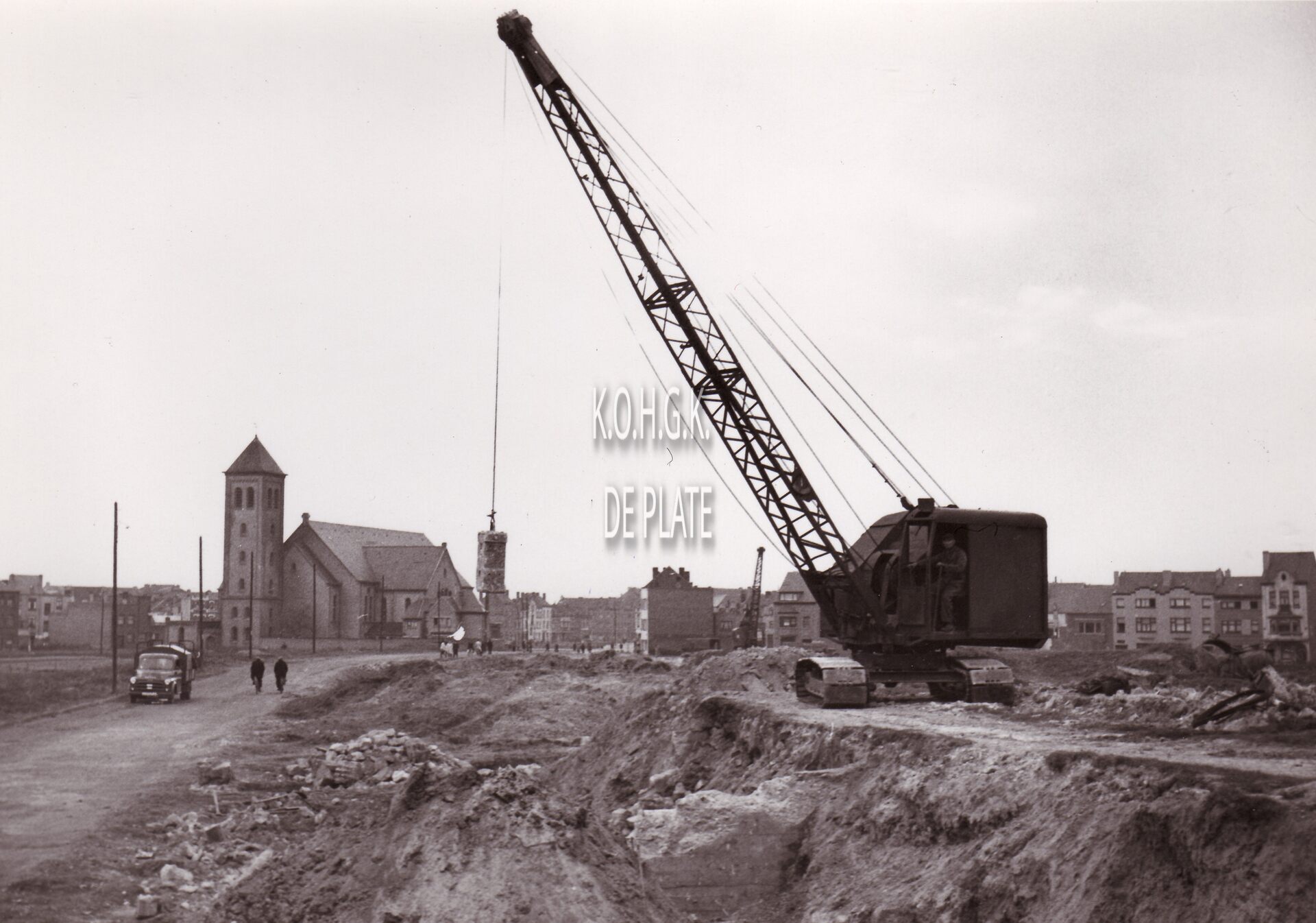 Formaat : 13 x 18 cm. - Aanleg van de Elisabethlaan nabij de Sint Janskerk. De kraan staat op het einde van de Soldatenbergs.