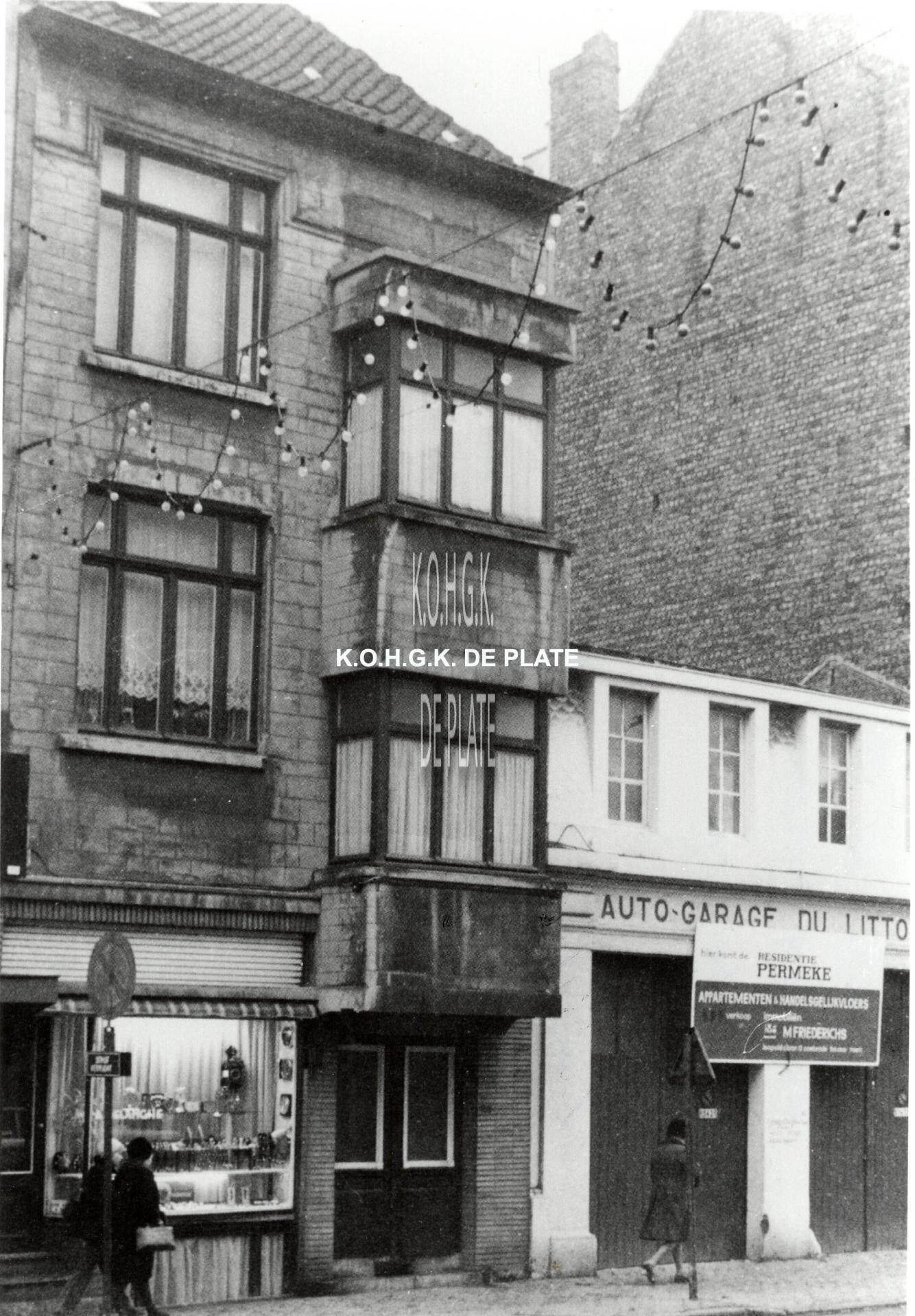 Formaat : 14 x 10 cm. - De achterkant van "Auto-Garage du Littoral" in de Alfons Pieterslaan. In de garage kon je ook je auto stationeren en langs die kant kon je ook buiten rijden. Het adres van de garage was Torhoutsesteenweg 66. We zien links de juwelierszaak van de familie Delanghe. De zaak werd in 1922 opgericht en bleef in familiebeheer tot 1972. Beide panden maakten plaats voor het "Permeke Shopping Center"