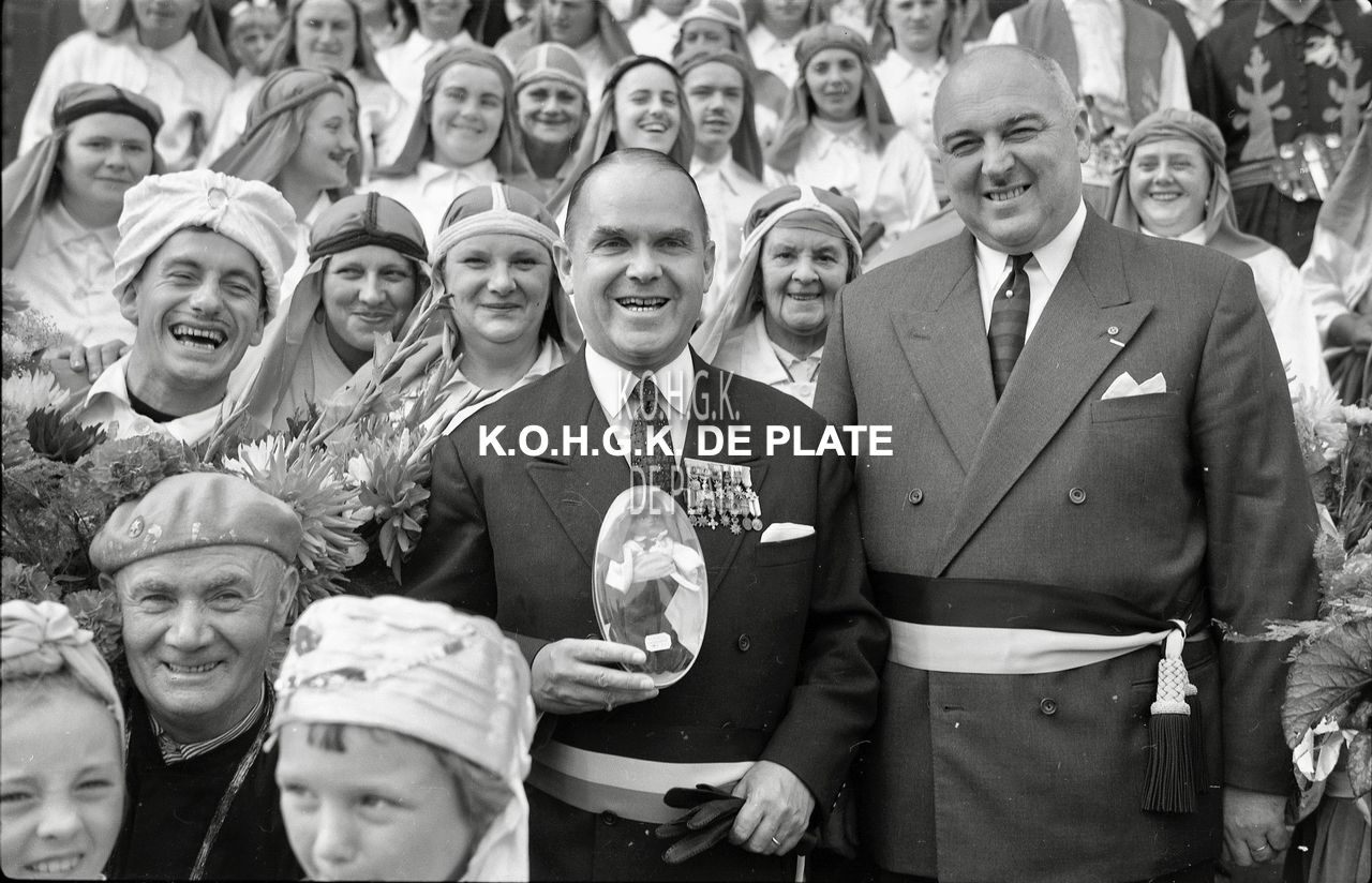 Formaat : 12,5 x 19 cm. - Burgemeester Adolf Van Glabbeke en schepen Maurice Quaghebeur sr. in het midden van de vrolijke groep naar aanleiding van de plechtige ontvangst en overhandiging van het nieuwe vaandel op het dienstdoend stadhuis (gerechtshof)