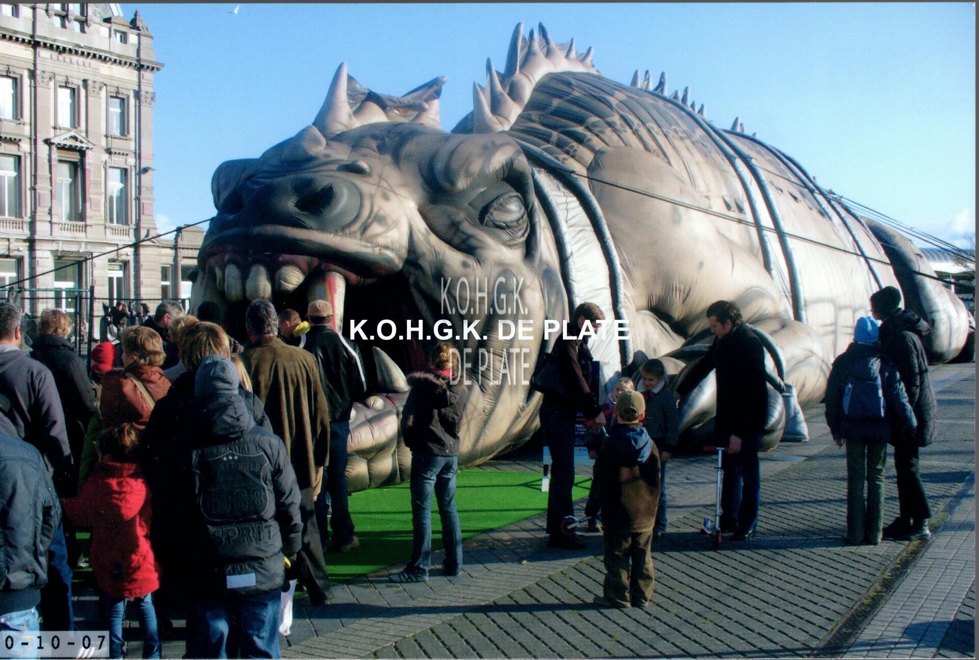 Formaat : 10 x 15 cm. - Het nagemaakte prehistorische zeemonster lag voor het station ter gelegenheid van halloween. Je kon een wandeling maken door de ingewanden.