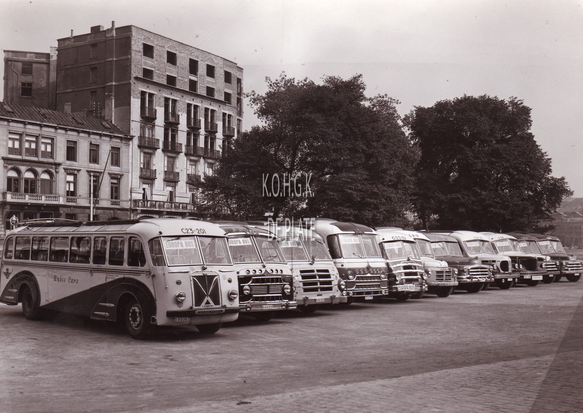 Formaat : 13 x 18 cm. - Een rij "Europa" autocars op het Canadaplein aan de Hendrik Serruyslaan. Op de achtergrond rechts, achter de bomen, het oud station. Het hoog gebouw rechts, hoek Hendrik Serruyslaan en Aartshertoginnestraat was gekend onder de naam Kanonhotel.