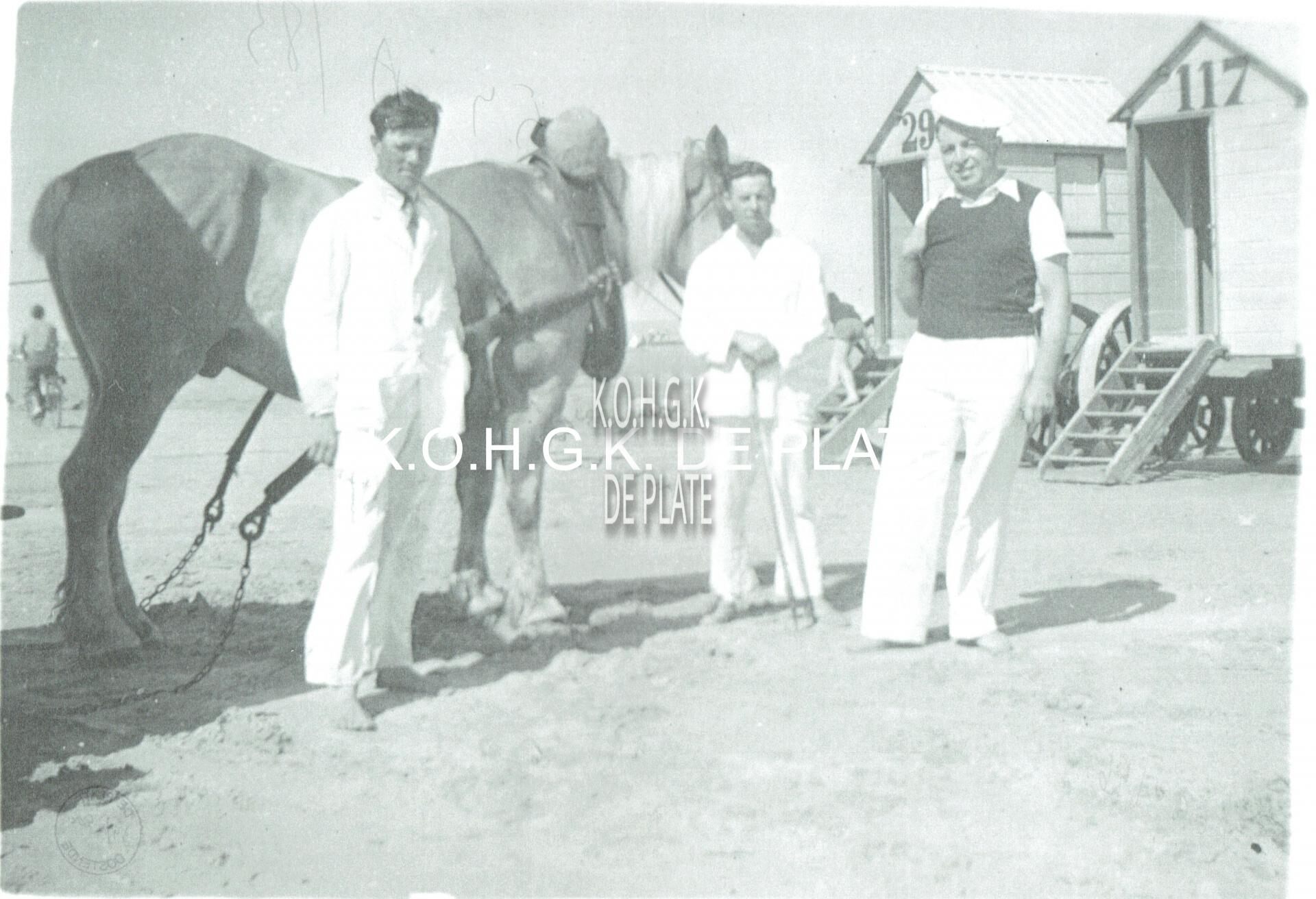 Vergroting. - Formaat : 29,5 x 40 cm. Drie mensen in dienst van de badendienst , waaronder rechts Albert Hautekiet (°04/04/1908-✝︎23/03/1983) en een paard dat de karren in zee trok