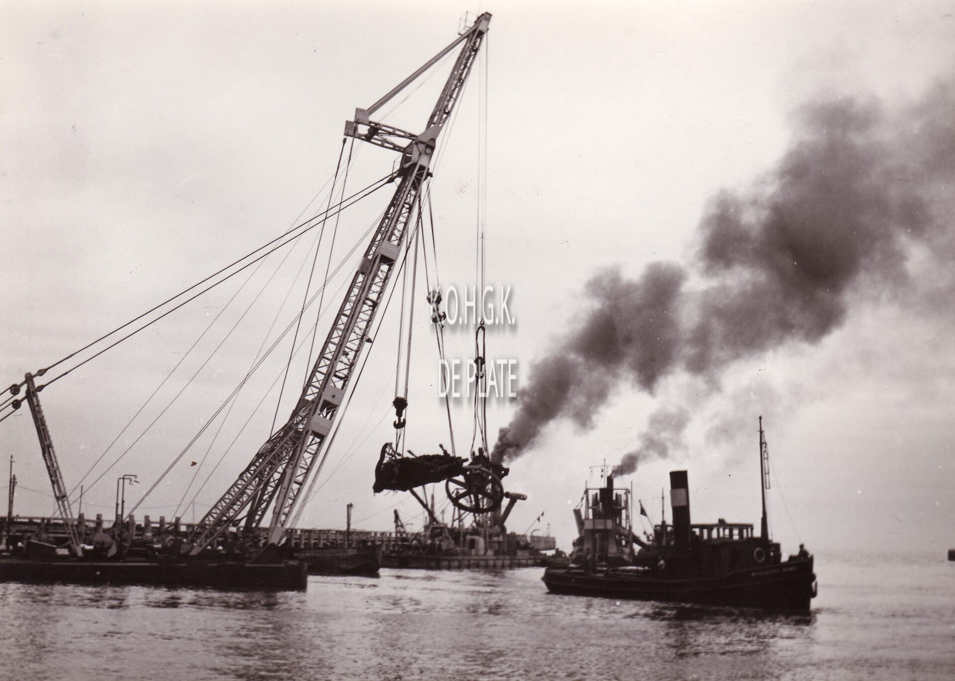 Formaat : 13 x 18 cm. - Er wordt gebaggerd in de havengeul. Op de voorgrond links haalt een hijskraan de resten van een wrak op