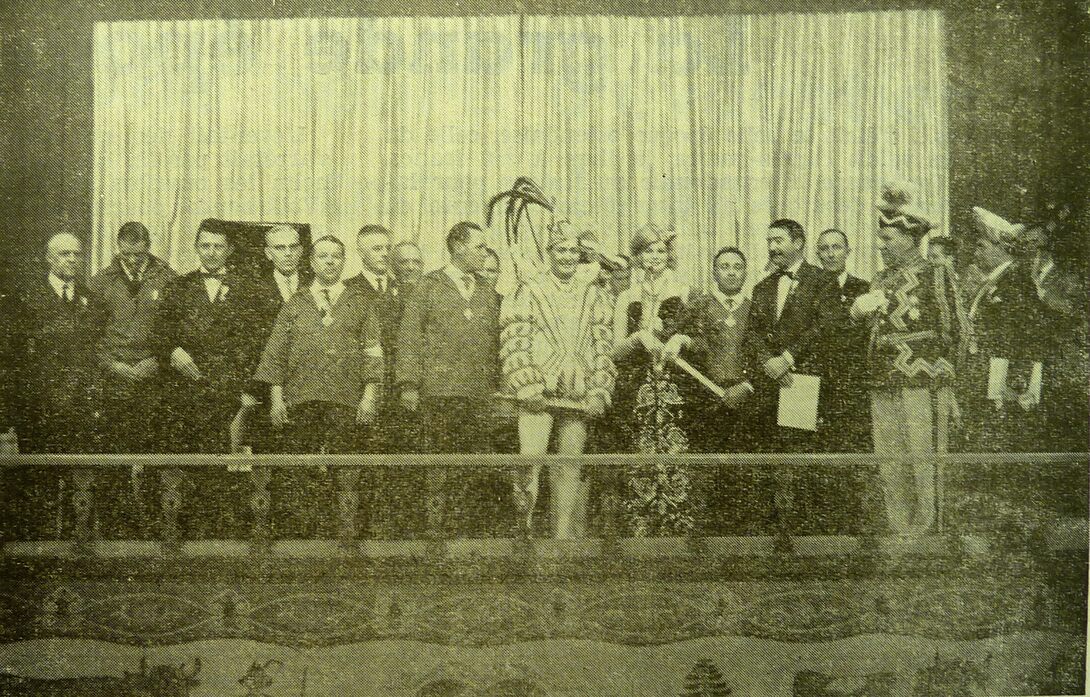 Foto : Prins carnaval van Dusseldorf tussen de leden van de "Orde van de Garnaal" in het "Wit Paard". We herkennen ook notaris Alfons Lacourt en schepen Roger De Kinder. (10/03/1962)