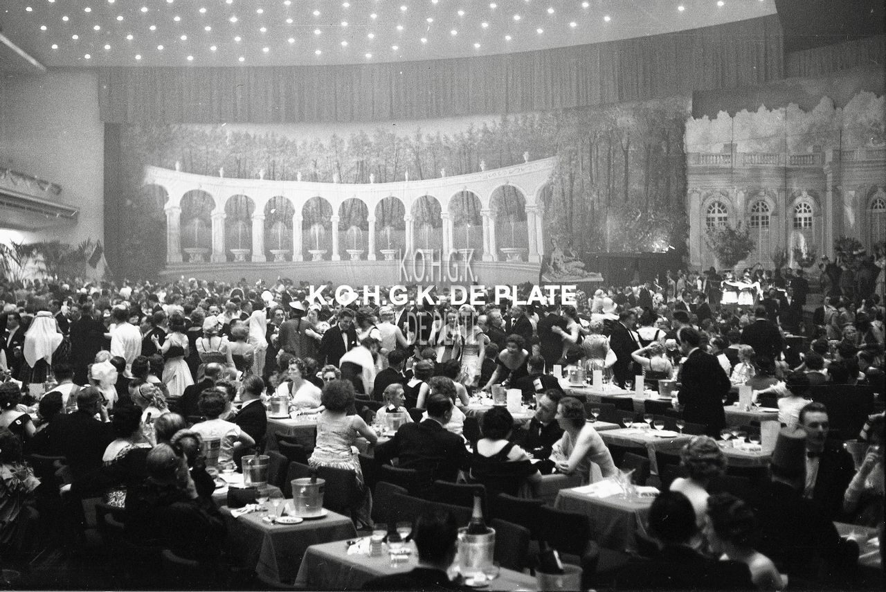 Negatief : 6 x 9 cm. - Op het bal met als thema : "Het Goede Oude Frankrijk" = "Si la France nous était contée" waren 7.200 deelnemers. Zij werden bediend door 15 zaalmeesters en 135 kelners. In de keukens zorgden 52 mensen voor de afwas. Er waren 12.000 glazen in omloop, en er werd 1.500 kg. voedsel verorberd en om de dranken te koelen had men twee ton ijs nodig. Verdere literatuur : Rat Mort Oostende 1898 - 1998. Koninklijke Coeciliakring Oostende, 1998. p.46. Plate Bib B448.