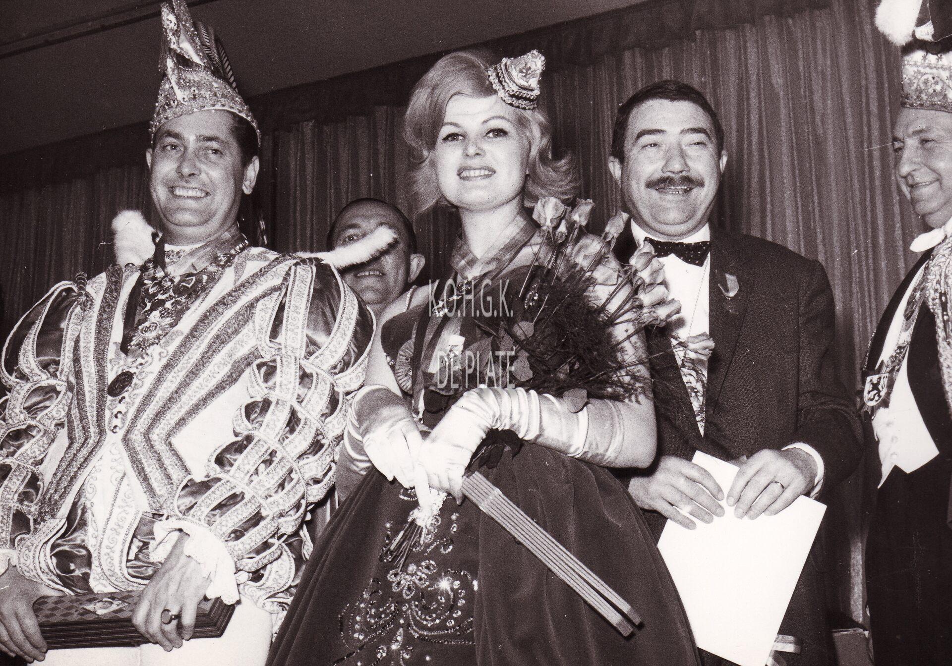 Formaat : 13 x 18 cm. - Prins Carnaval van Düsseldorf en zijn eredame op het Bal du Rat Mort in het Casino-Kursaal. Tweede van rechts, Roger De Kinder, schepen en later provinciegouverneur van Oost-Vlaanderen.