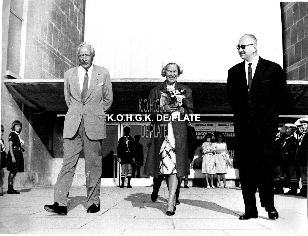 Formaat : 18 x 24 cm. - Tentoonstelling met beeldhouwwerken van Koningin Elisabeth in de Montrosezaal van 14 tot 22/08/1965 ten voordele van Oxfam. Zij wordt begroet door een ere-haag van Oostendse scouts (links) en sea-scouts (rechts). Zij is in het gezelschap van haar echtgenoot en Roger De Ramée (rechts), directeur van de Kursaal.