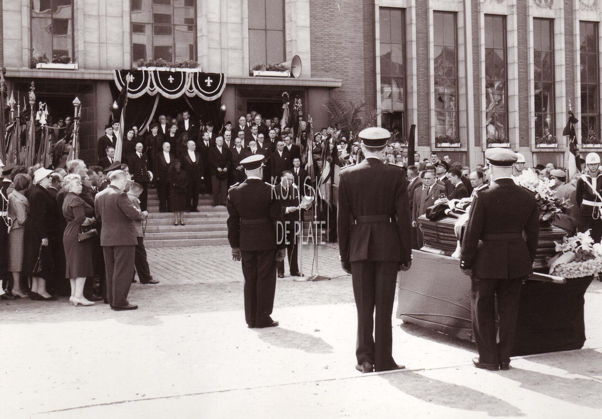 Formaat : 13 x 18 cm. - Begrafenis van burgemeester Adolphe Van Glabbeke, vertrek van de lijkkist aan het dienstdoend stadhuis (huidig gerechtshof).