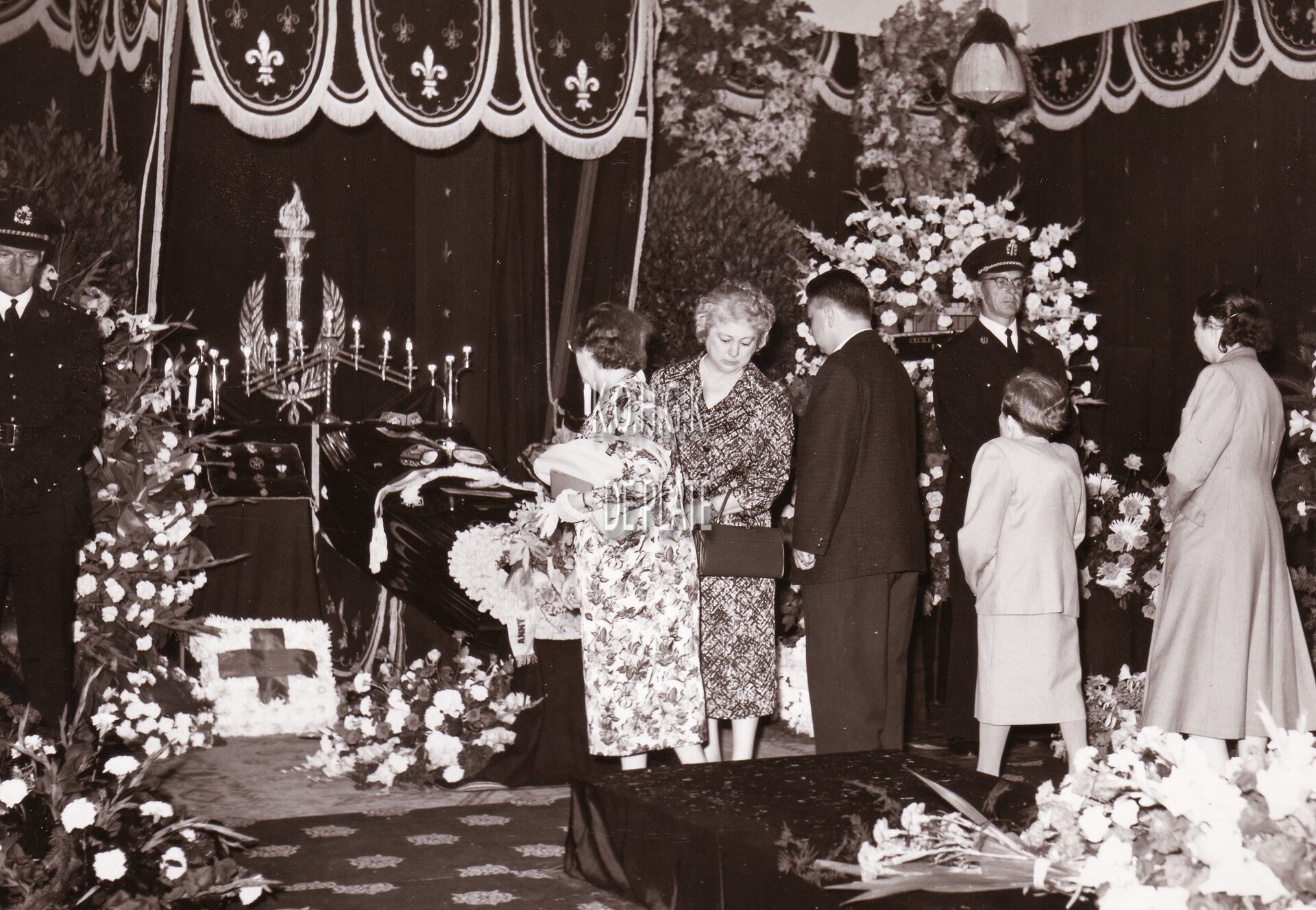 Formaat : 13 x 18 cm. - De lijkkist van burgemeester Adolphe Van Glabbeke in het stadhuis aan het Canadaplein (huidig gerechtshof). De rouwkamer werd ingericht door de firma David (Langestraat). De begrafenisondernemer is Willy Lucas.