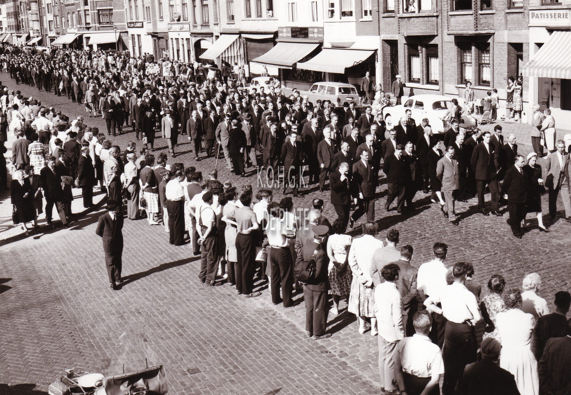 Formaat : 13 x 18 cm. - De begrafenisstoet van burgemeester Adolphe Van Glabbeke aan het Prof. Mac Leodplein en de Torhoutsesteenweg. Op de tweede rij van links naar rechts,schepen John Lauwereins, burgemeester Jan Piers en schepen Henri Edebau.