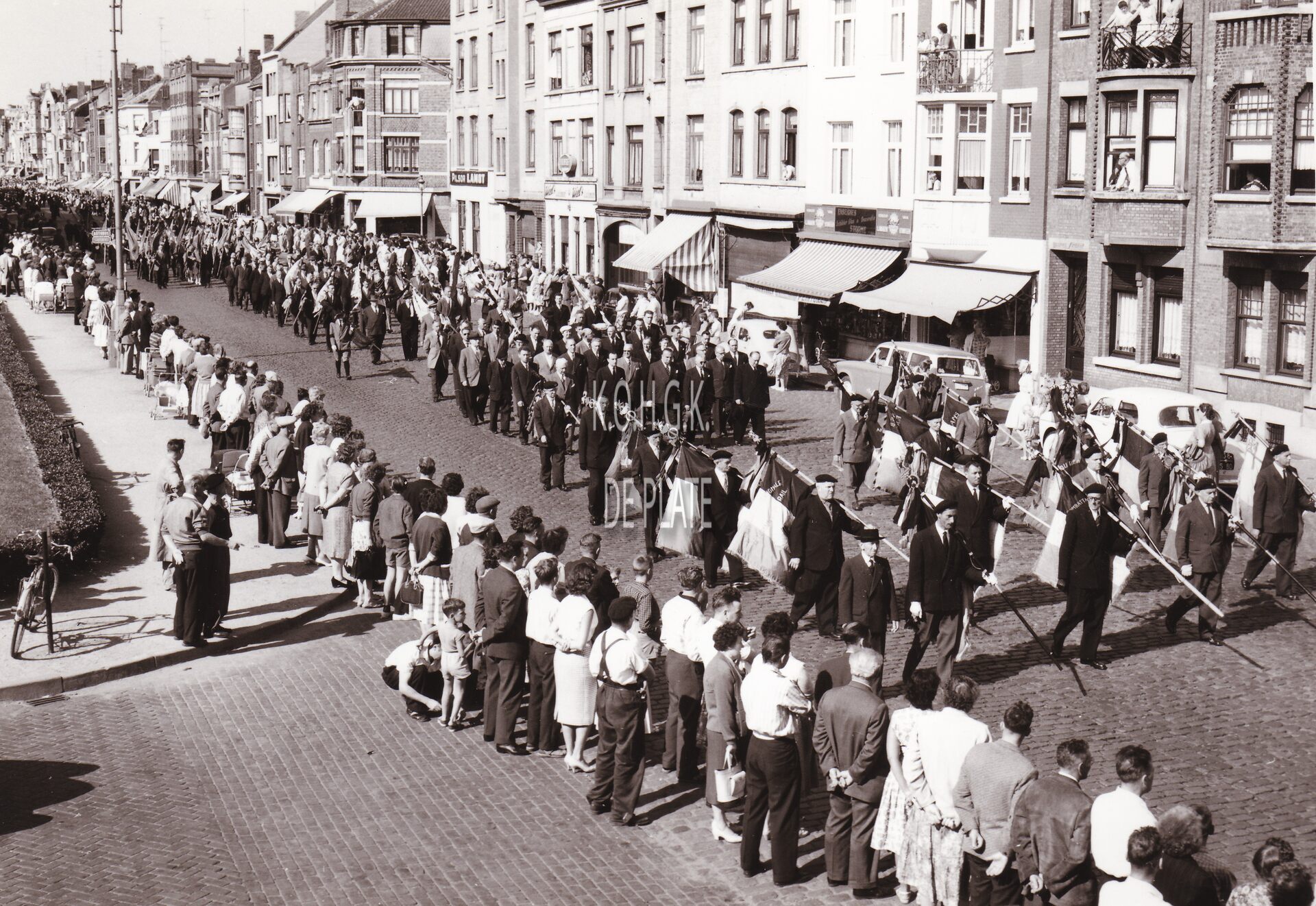 Formaat : 13 x 18 cm. - De begrafenisstoet van burgemeester Adolphe Van Glabbeke op de Torhoutsesteenweg aan het Prof. Mac Leodplein (links), op weg naar het kerkhof in de Stuiverstraat.