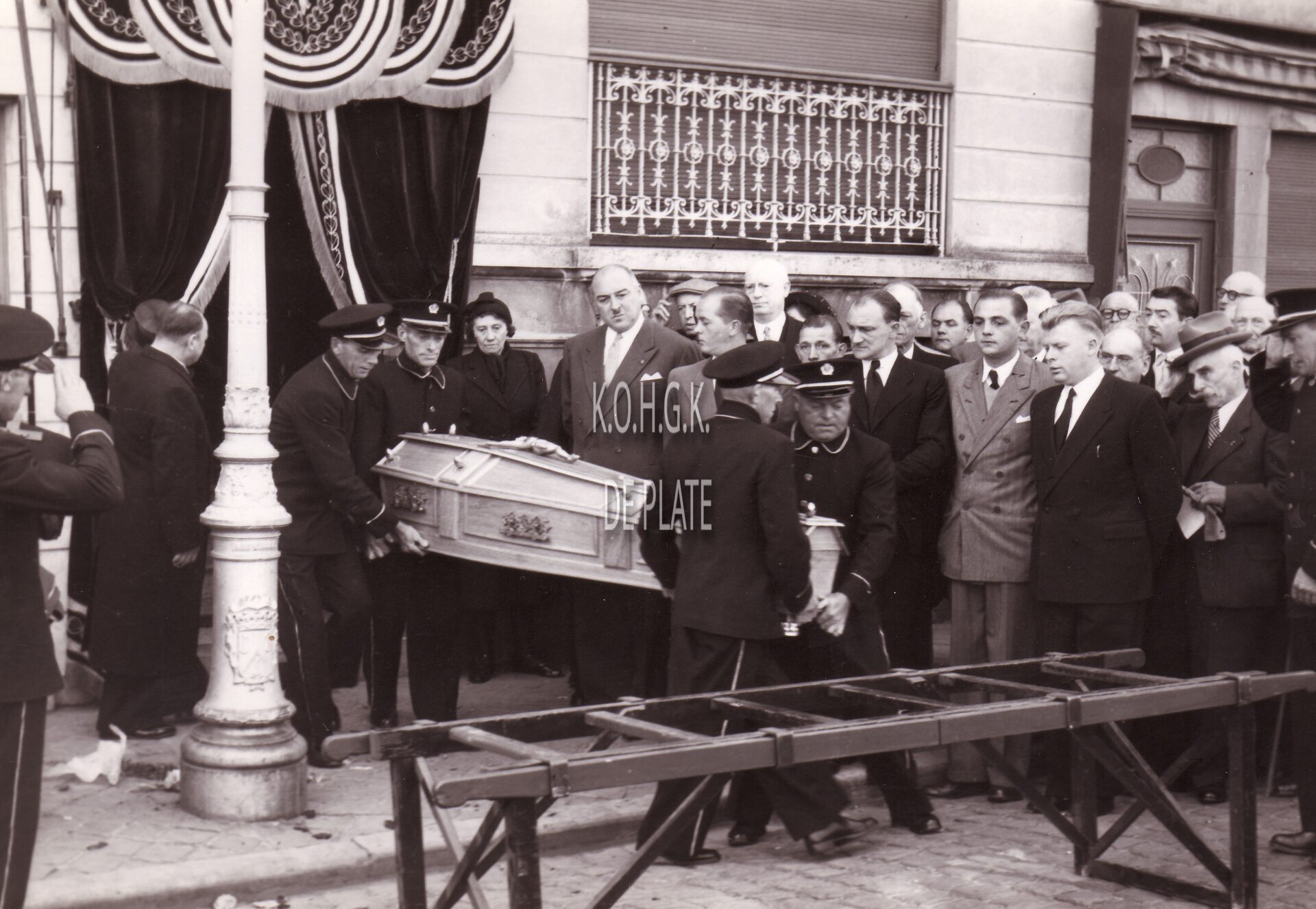 Formaat : 13 x 18 cm. - Begrafenis van Arthur Vanhoutte, Mariakerks politiek figuur, gemeenteraadslid voor de liberalen. De lijkkist vertrekt uit het sterfhuis, achter de lijkkist staat schepen Maurice Quaghebeur. Links van de lantaarnpaal begrafenisondernemer Gaston Bourgoignie. Het rouwbaldakijn werd verzorgd door de firma David.
