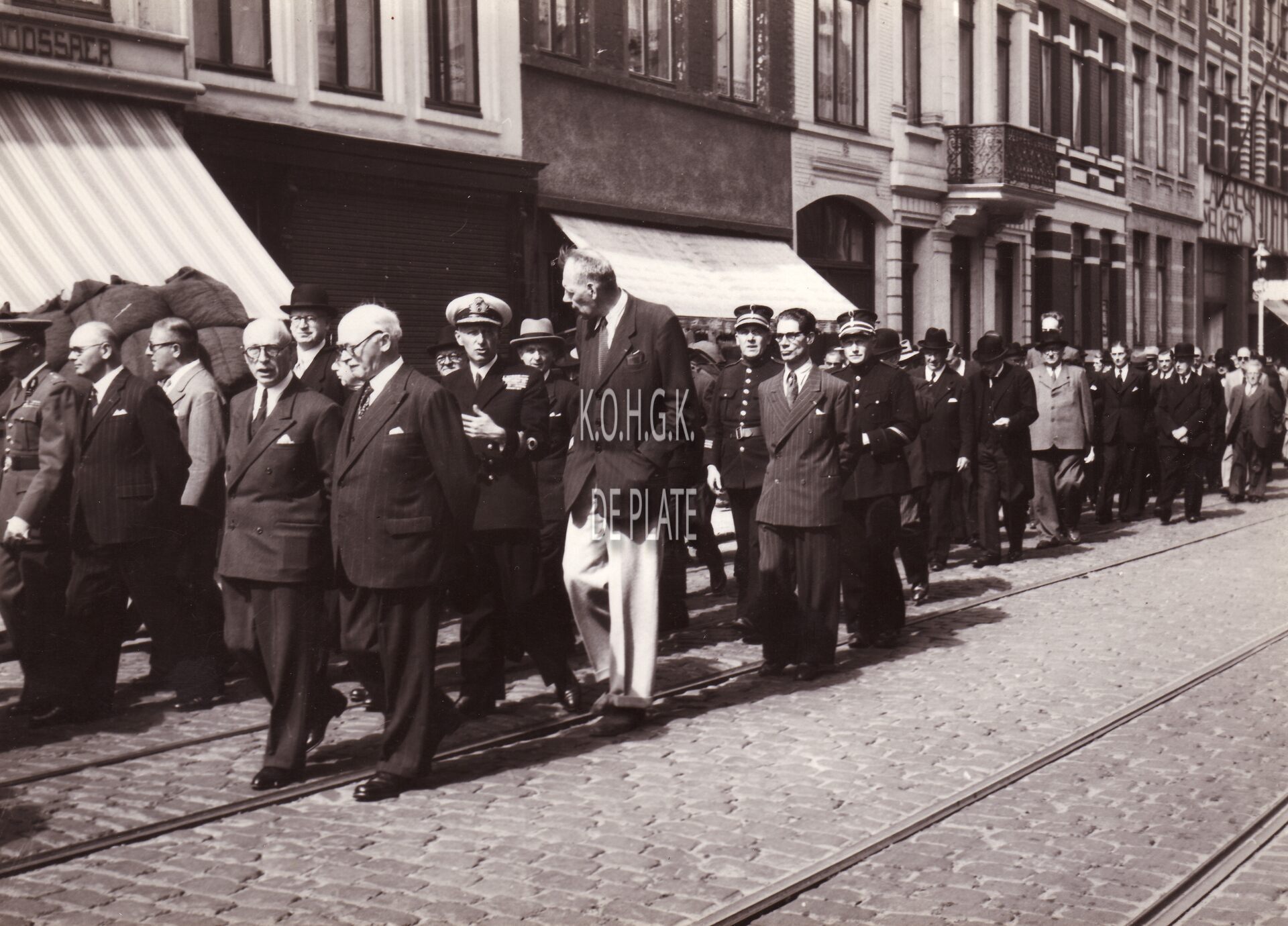 Formaat : 13 x 18 cm. - De begrafenisstoet van Ernest Van Glabbeke op de Nieuwpoortsesteenweg. Tweede van rechts vooraan loopt burgemeester Hendrik Sserruys, achter hem (met bolhoed) stadssecretaris Michel Surmont, op de tweede rij tweede van rechts commodore Georges Timmermans.