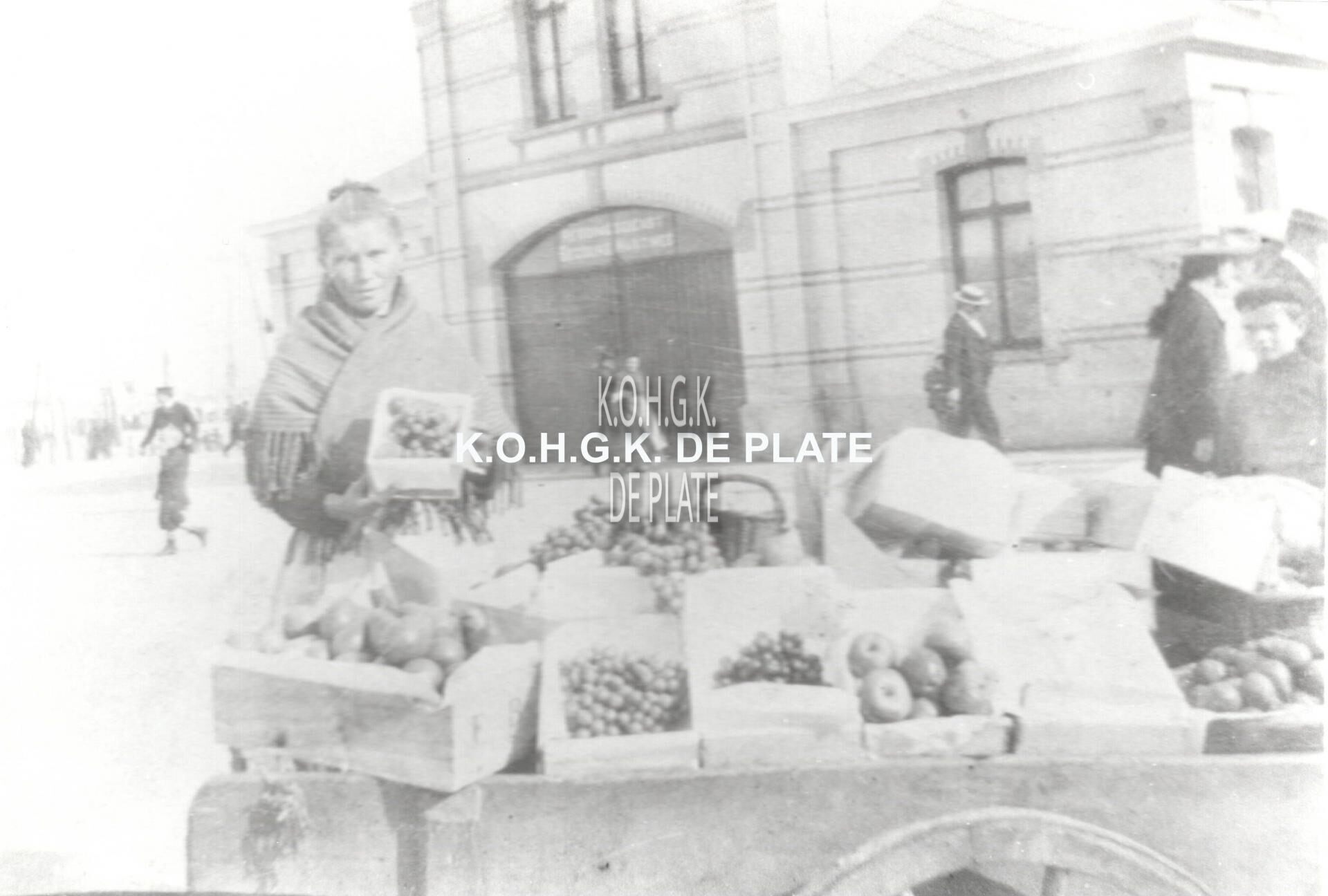 Formaat : 9,5 x 14 cm. - Op de voorgrond een straatvenster van groenten en fruit voor het gebouw van de Bestendige reddingsdienst, waar nu het Monument der Zeelieden staat.