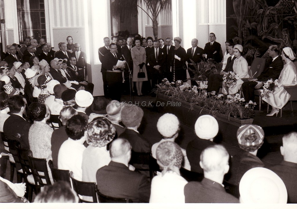 Elizabeth II, koningin van het Verenigd Koninkrijk en prins Philip, hertog van Edinburgh tussen koning Boudewijn en koningin Fabiola, luisteren naar een toespraak door John Lauwereins, waarnemend burgemeester, tijdens hun bezoek aan Oostende. Ze kwamen uit Brugge per trein en werden ontvangen in het salon van het zeestation.