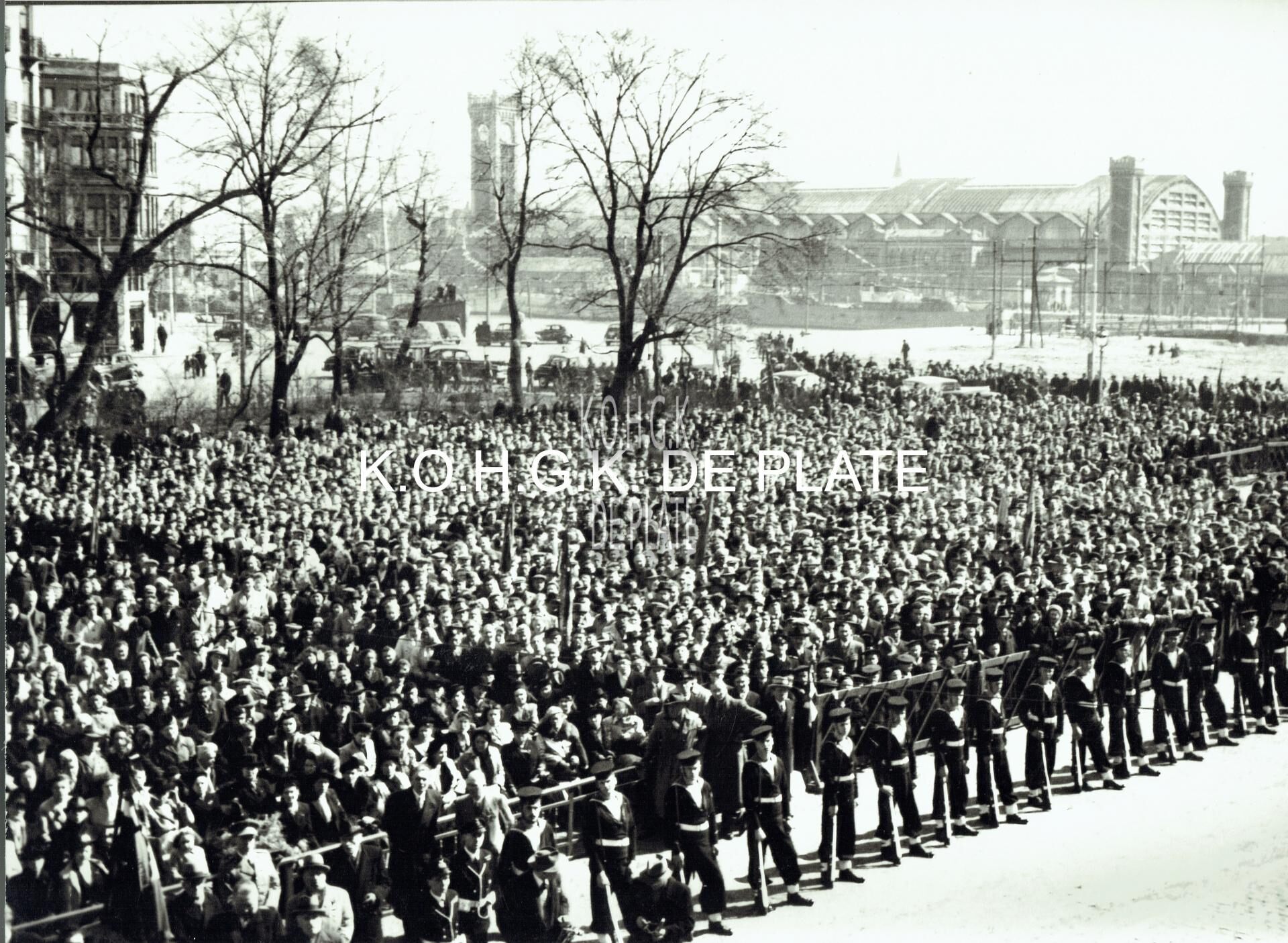 Vergroting. - Formaat : Veldmaarschalk Montgomery werd ontvangen op het stadhuis, toen op gevestigd in het Gerechtshof op het Canadaplein. Massale publieke belangstelling. Op achtergrond uiterst links een hoekje van het "Kanonhotel" en rechts het Oude Station.